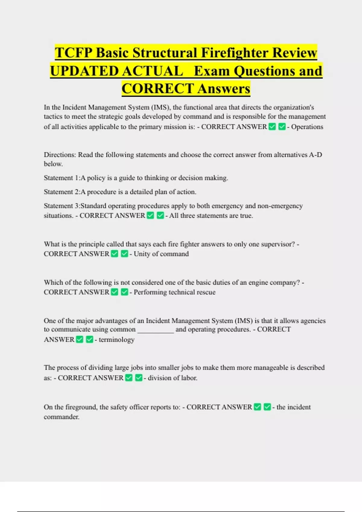 TCFP Basic Structural Firefighter Review UPDATED ACTUAL Exam Questions and CORRECT Answers In the Incident Management System (IMS), the functional area that directs the organization's tactics to meet the strategic goals developed by command and is responsible for the management of all activities applicable to the primary mission is: - CORRECT ANSWER - Operations Directions: Read the following statements and choose the correct answer from alternatives A-D below. Statement 1:A policy is a guide to thinking or decision making. Statement 2:A procedure is a detailed plan of action. Statement 3:Standard operating procedures apply to both emergency and non-emergency situations. - CORRECT ANSWER - All three statements are true