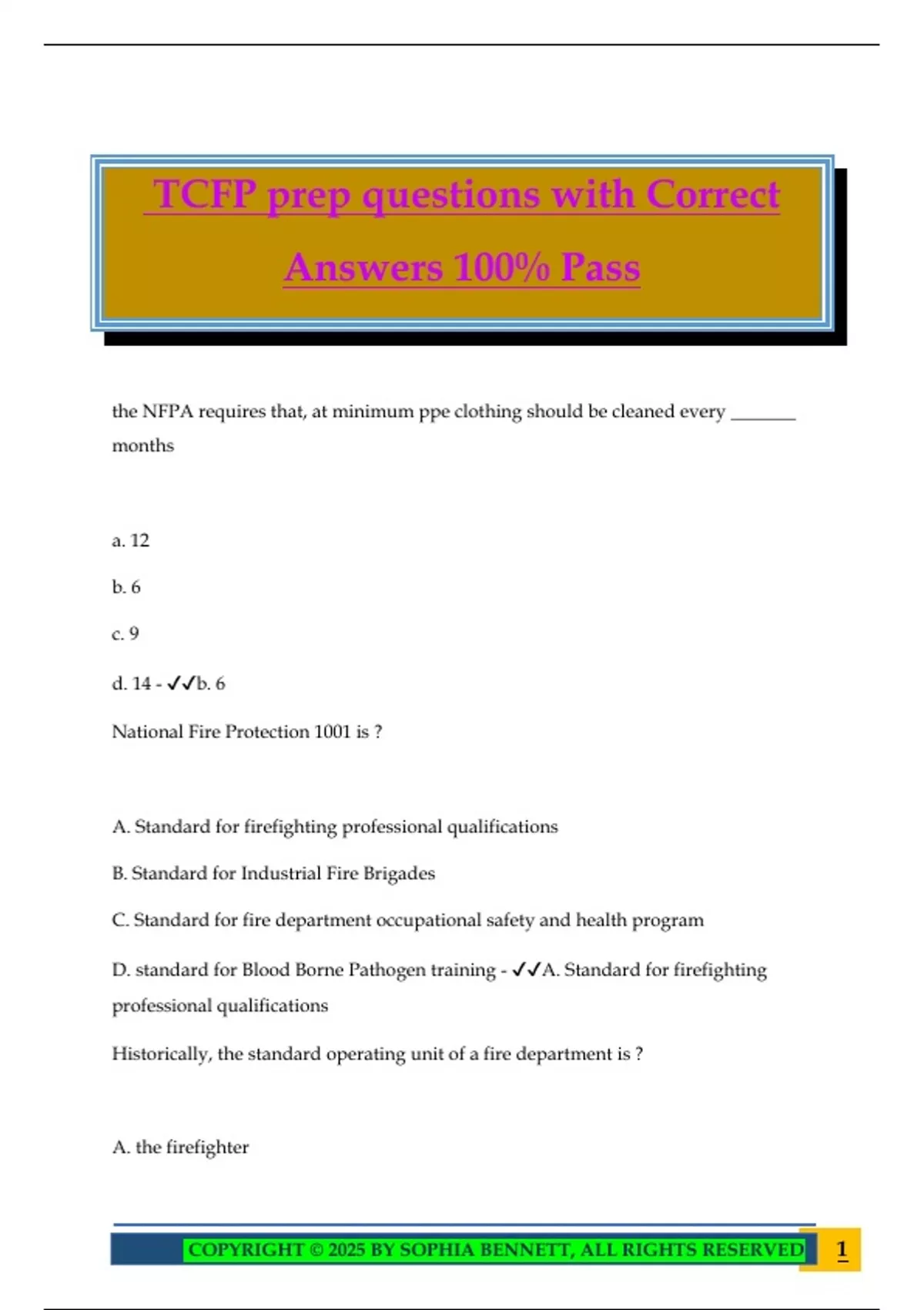 TCFP prep questions with Correct Answers 100% Pass the NFPA requires that, at minimum ppe clothing should be cleaned every _______ months a. 12 b. 6 c. 9 d. 14 - b. 6 National Fire Protection 1001 is ? A. Standard for firefighting professional qualifications B. Standard for Industrial Fire Brigades C. Standard for fire department occupational safety and health program D. standard for Blood Borne Pathogen training - A. Standard for firefighting professional qualifications Historically, the standard operating unit of a fire department is ? A. the firefighter 2COPYRIGHT © 2025 BY SOPHIA BENNETT, ALL RIGHTS RESERVED B. The company C. the battalion D. a platoon/shift - B. The company Where are medical requirements for firefighters specified ? A. NFPA 1582 B. NFPA 1001 C. NFPA 1500 D. NFPA 1501 - A. NFPA 1582 Directions: Read the following statements and choose the correct answer from alternatives A-D Statement 1: A policy is a guide to thinking or decision making Statement 2: a procedure is a detailed plan of action Statement 3: Standard operating procedures apply to both emergency and non- emergency situations A. st. 1 is true; st 2 and 3 are false B. st 1 and 2 are false; st 3 is true C. St 1 is false; st 2 and 3 are true D. all statements are true - D. all statements are true 3COPYRIGHT © 2025 BY SOPHIA BENNETT, ALL RIGHTS RESERVED Which is true regarding NFPA standards A. they are regarded as law B. they consensus documents C. they are adopted at the federal level D. they identify the maximum allowable by law. - B. they consensus documents What is the difference in a dept's SOP's as opposed to the SOG's ? A. SOP's are specific, and SOG's are not B. SOP's and SOG's are exactly alike C. SOP's are not as strict as SOG's D. Both are required to meet NFPA 1500 requirements. - A. SOP's are specific, and SOG's are not Life safety, incident stabili