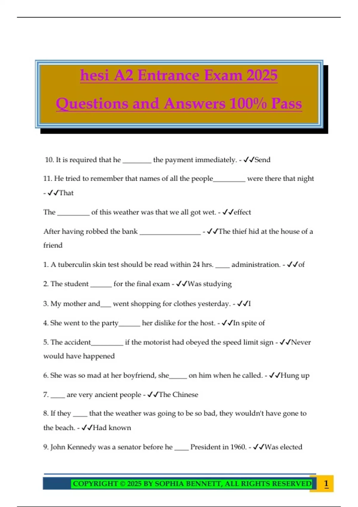 hesi A2 Entrance Exam 2025 Questions and Answers 100% Pass 10. It is required that he ________ the payment immediately. - Send 11. He tried to remember that names of all the people_________ were there that night - That The _________ of this weather was that we all got wet. - effect After having robbed the bank _________________ - The thief hid at the house of a friend 1. A tuberculin skin test should be read within 24 hrs. ____ administration. - of 2. The student ______ for the final exam - Was studying 3. My mother and___ went shopping for clothes yesterday. - I 4. She went to the party______ her dislike for the host. - In spite of 5. The accident_________ if the motorist had obeyed the speed limit sign - Never would have happened 6. She was so mad at her boyfriend, she_____ on him when he called. - Hung up 7. ____ are very ancient people - The Chinese 8. If they ____ that the weather was going to be so bad, they wouldn't have gone to the beach. - Had known 9. John Kennedy was a senator before he ____ President in 1960. - Was elected 2COPYRIGHT © 2025 BY SOPHIA BENNETT, ALL RIGHTS RESERVED 12. A synonym is a word _________ a meaning similar to another word. - Who have 13. After having robbed the bank,_______. - The thief hid at the house of a friend. 1) After the policeman had ran for several miles, he finally caught up with the man who had stolen the purse. - Had ran 2) The man's heart attack scared him badly and he decided having a regular check- up from then on. - Badly 3) Based on the principals of asepsis, the nurse should consider a sterile packet below waist level to be contaminated. - Principals 4) I will call you when I will get back from visiting my sister. - Will get 5) Her mother asked her what would she do after she graduated from - she 6) When you add sugar to it, your cup of coffee be