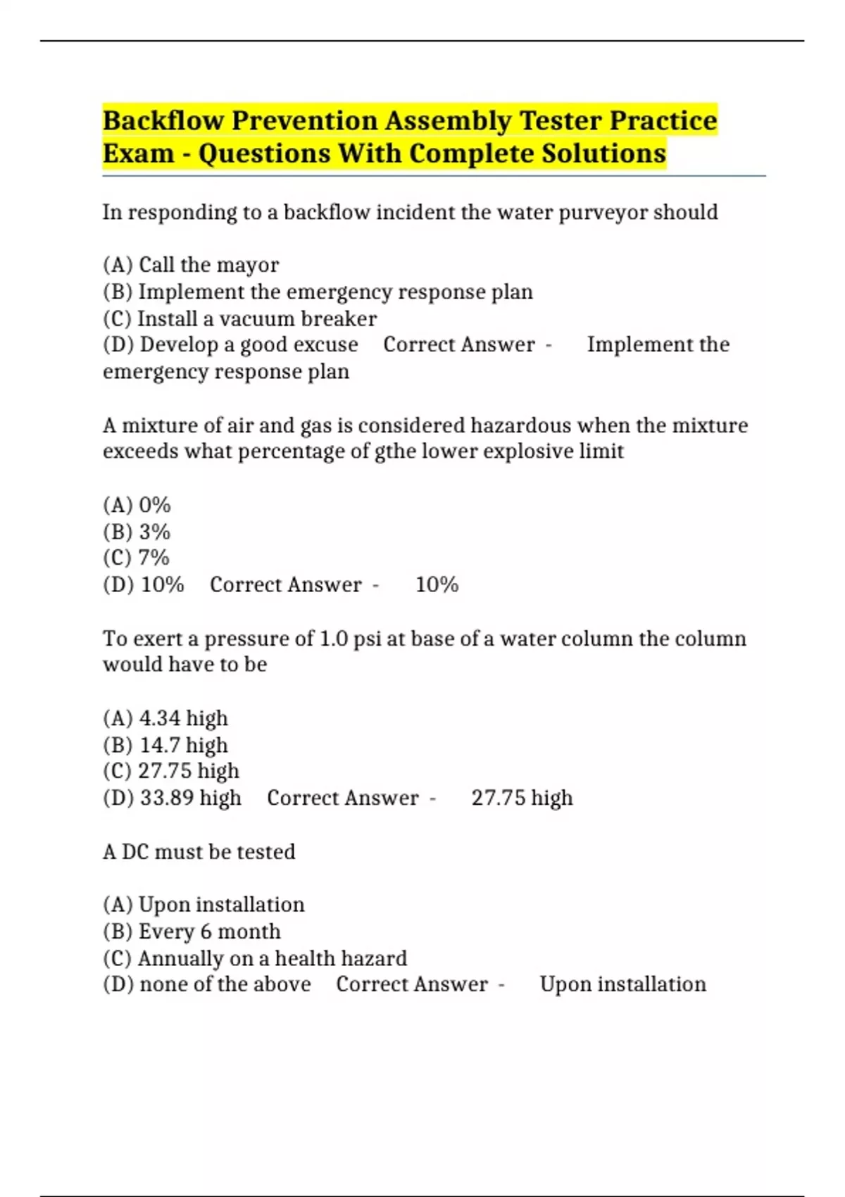 Backflow Prevention Assembly Tester Practice Exam - Questions With Complete Solutions