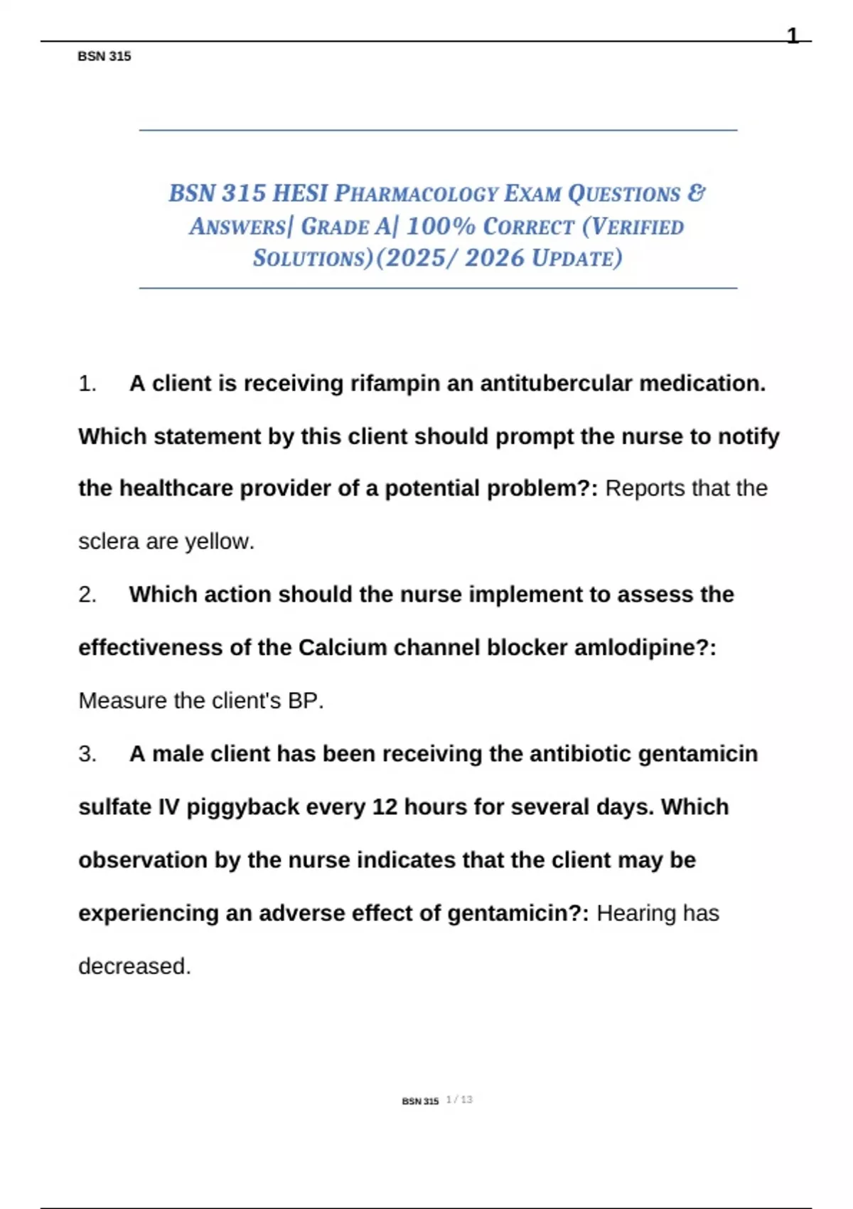 BSN 315 HESI PHARMACOLOGY EXAM QUESTIONS &