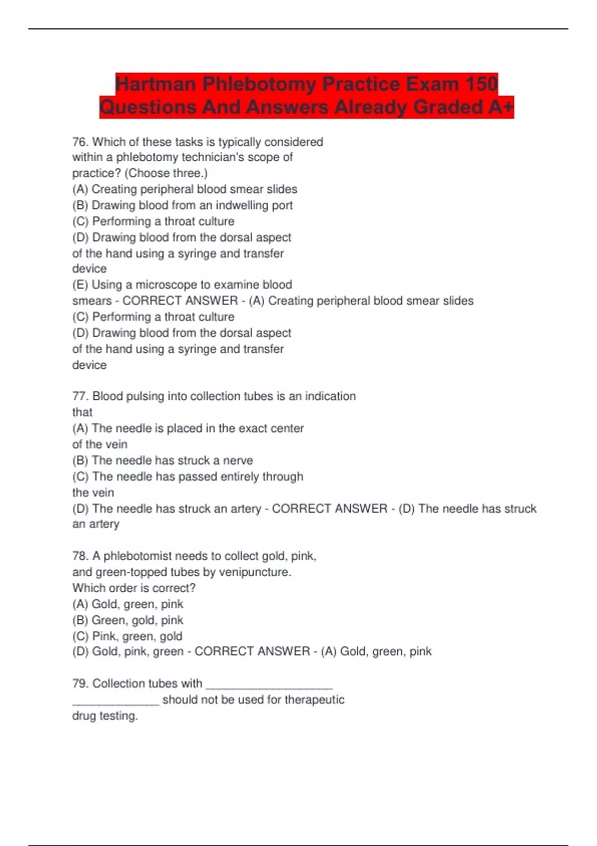Hartman Phlebotomy Practice Exam 150 Questions And Answers Already Graded A+76. Which of these tasks is typically considered within a phlebotomy technician's scope of practice? (Choose three.) (A) Creating peripheral blood smear slides (B) Drawing blood from an indwelling port (C) Performing a throat culture (D) Drawing blood from the dorsal aspect of the hand using a syringe and transfer device (E) Using a microscope to examine blood smears - CORRECT ANSWER - (A) Creating peripheral blood smear slides (C) Performing a throat culture (D) Drawing blood from the dorsal aspect of the hand using a syringe and transfer device 77. Blood pulsing into collection tubes is an indication that (A) The needle is placed in the exact center of the vein (B) The needle has struck a nerve (C) The needle has passed entirely through the vein (D) The needle has struck an artery - CORRECT ANSWER - (D) The needle has struck an artery 78. A phlebotomist needs to collect gold, pink, and green-topped tubes by venipuncture. Which order is correct? (A) Gold, green, pink (B) Green, gold, pink (C) Pink, green, gold (D) Gold, pink, green - CORRECT ANSWER - (A) Gold, green, pink 79. Collection tubes with ___________________ _____________ should not be used for therapeutic drug testing. (A) Separator gel (B) Clot activator (C) Red tops (D) Internal vacuum - CORRECT ANSWER - (A) Separator gel 80. Which of the following will help a phlebotomy technician avoid having a patient's vein roll away when the needle is inserted? (A) Selecting a vein in the hand (B) Forming an anchoring "window" around the puncture site with the thumb below and the index finger above (C) Anchoring the site from below, using the thumb to pull toward the wrist (D) Warming the site for 3-5 minutes prior to venipuncture - CORRECT ANSWER - (C) Anchoring the site from below, using the thumb to pull toward the wrist 81. Facility policy states that no more than 5% of a patient's blood may be drawn in 30 days. What is the maximum amount of blood than can be drawn from an 9-pound infant in a month? (A) 12 mL (B) 16 mL (C) 20 mL (D) 24 mL - CORRECT ANSWER - (B) 16 mL 82. A patient's chart indicates that her veins are thin, fragile, and frequently collapse. A total of 5 mL of blood needs to be drawn for various tests. Which of the following techniques would be best for drawing blood from this patient? (A) Capillary puncture of the third or fourth finger (B) Venipuncture using a 23-gauge butterfly needle and syringe/transfer device (C) Venipuncture using a 21-gauge straight multisample needle (D) Venipuncture using a 23-gauge butterfly needle and a 5 mL evacuated tube - CORRECT ANSWER - (B) Venipuncture using a 23-gauge butterfly needle and syringe/transfer device 83. Which of the following is a significant difference between midstream and routine urine specimens? (A) The area around the urethra is cleaned before collecting a midstream specimen (B) A routine urine specimen is collected first thing in the morning (