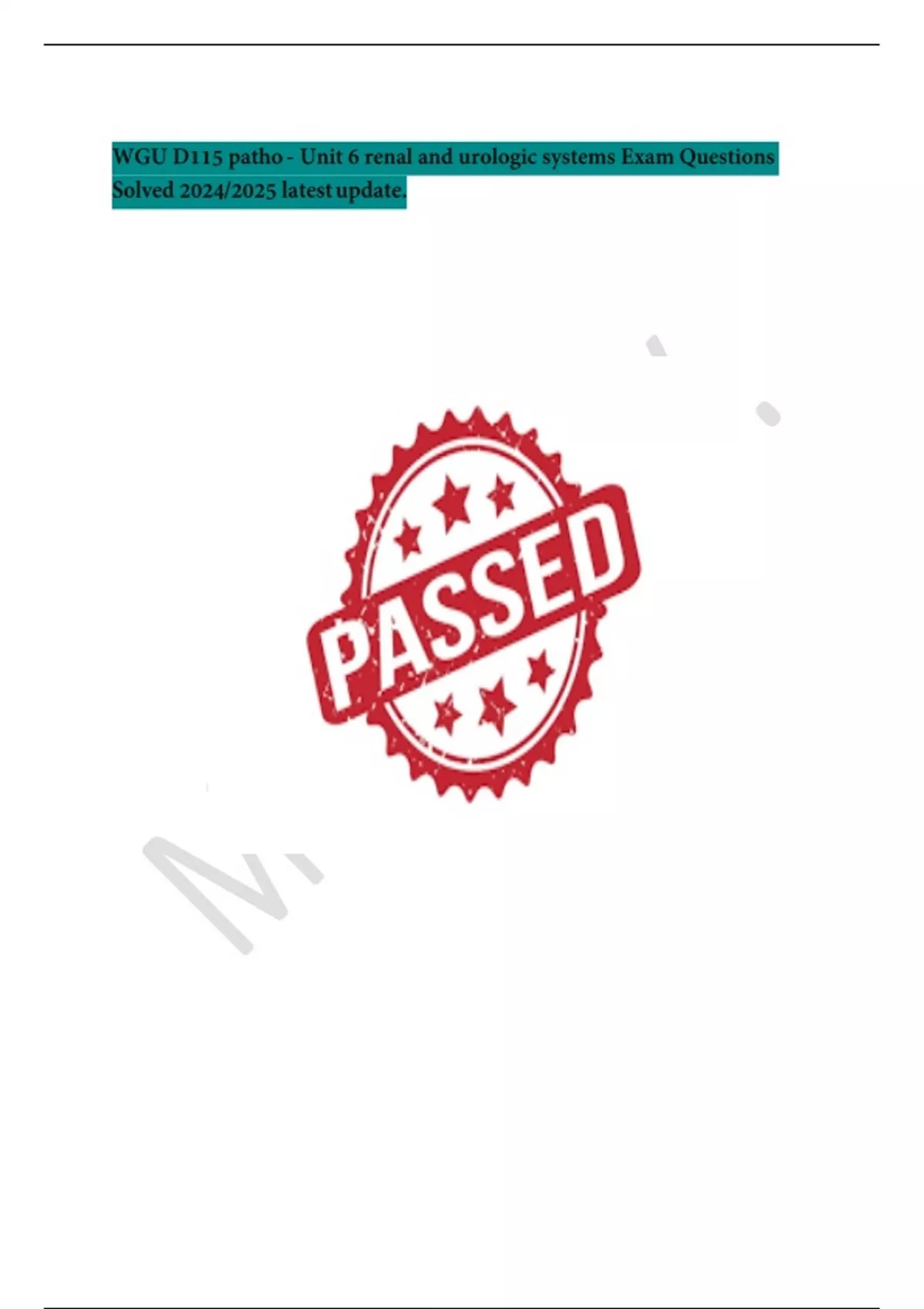 WGU D115 patho - Unit 6 renal and urologic systems Exam Questions Solved 2024/2025 latest update.
