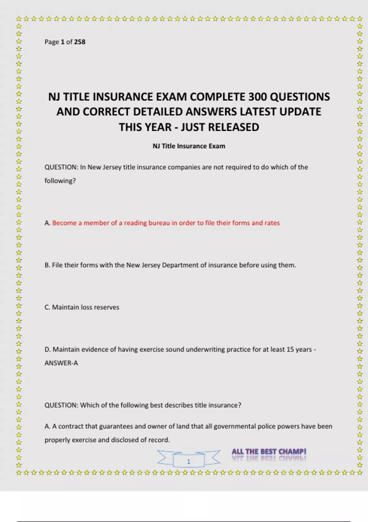 NJ TITLE INSURANCE EXAM COMPLETE 300 QUESTIONS