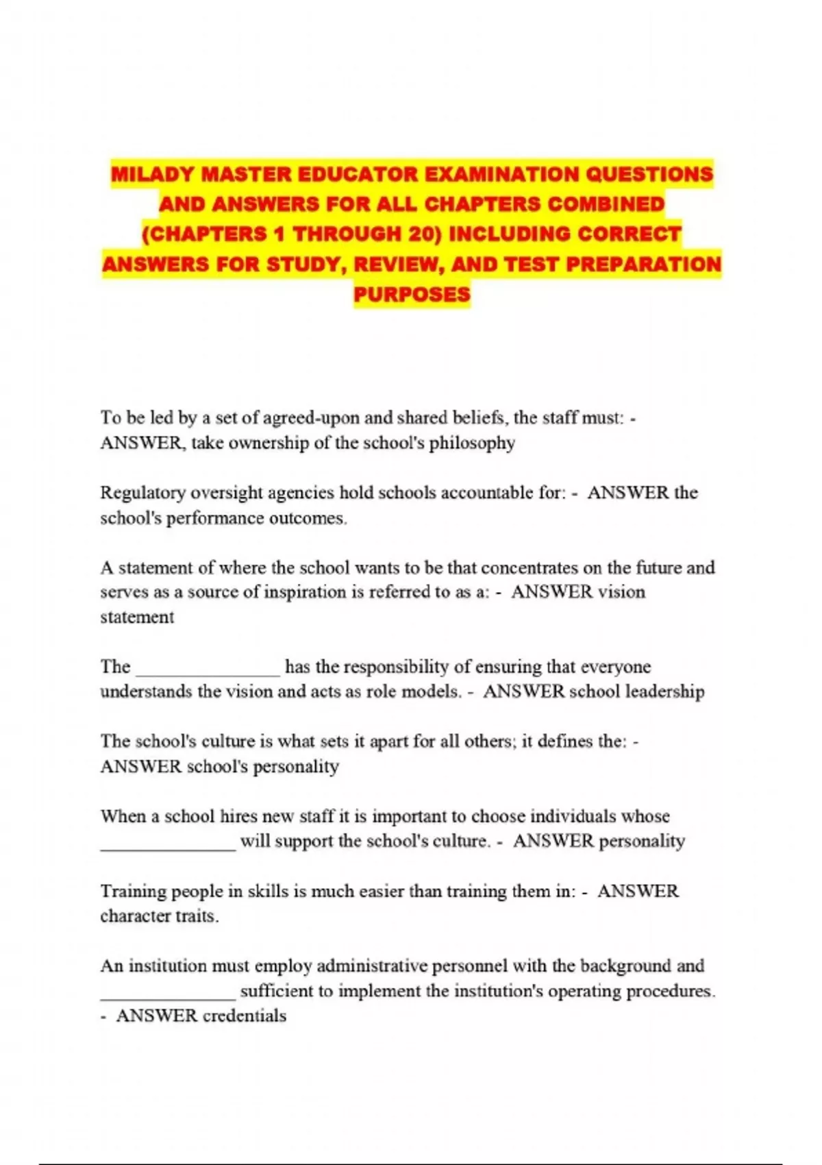 MILADY MASTER EDUCATOR EXAMINATION QUESTIONS AND ANSWERS FOR ALL CHAPTERS COMBINED (CHAPTERS 1 THROUGH 20) INCLUDING CORRECT ANSWERS FOR STUDY, REVIEW, AND TEST PREPARATION PURPOSES....