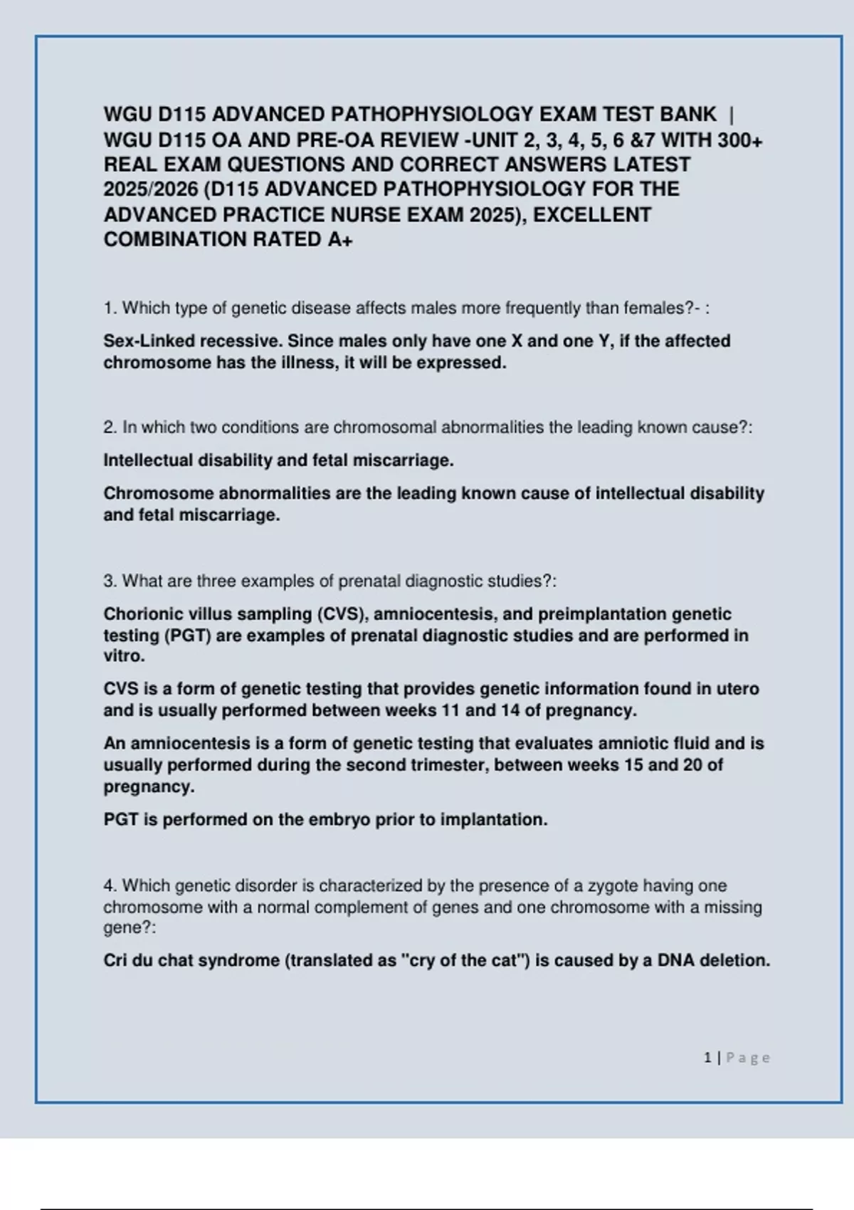 WGU D115 ADVANCED PATHOPHYSIOLOGY EXAM TEST BANK |
