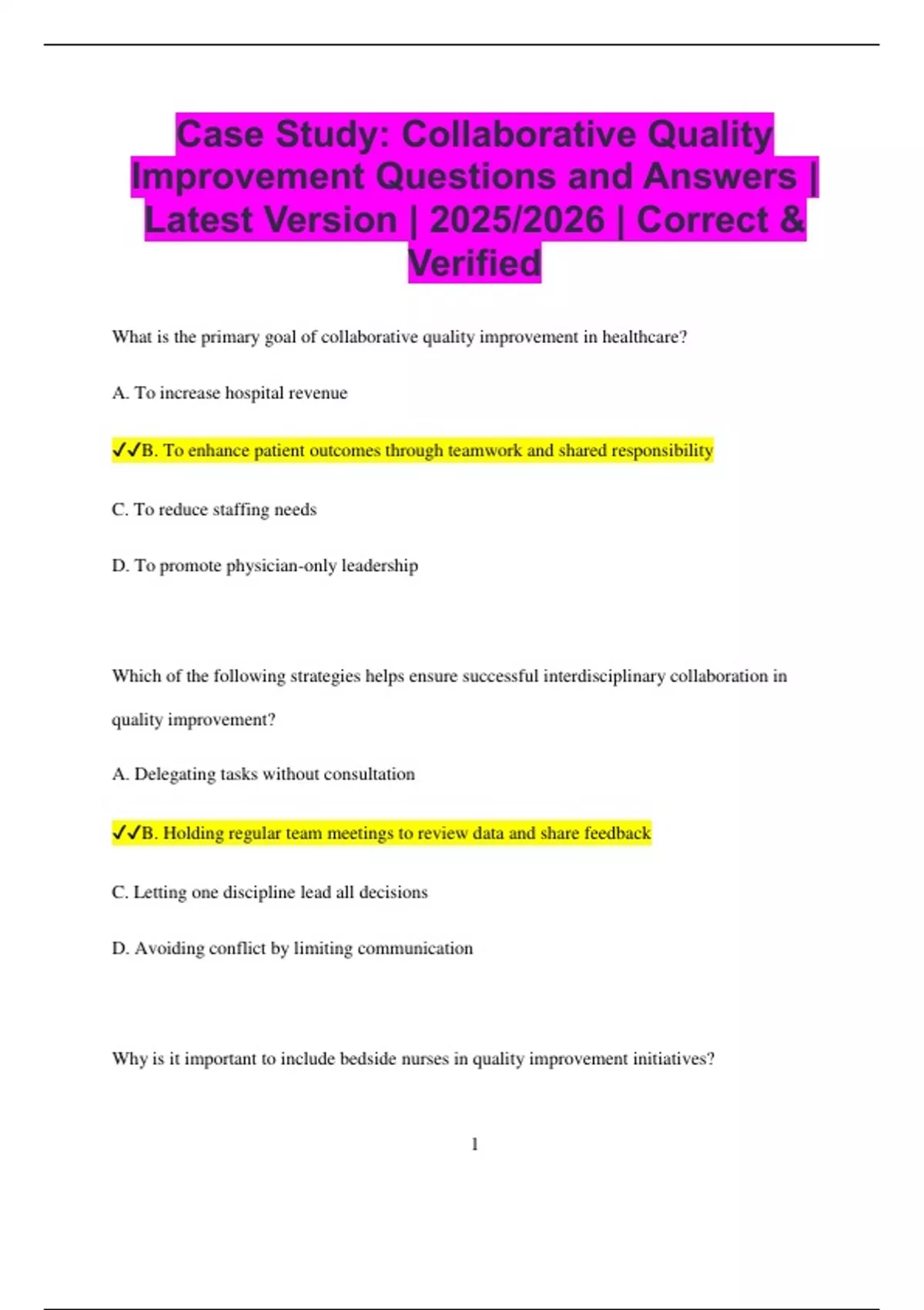 Case Study: Collaborative Quality Improvement Questions and Answers | Latest Version | 2025/2026 | Correct & Verified What is the primary goal of collaborative quality improvement in healthcare? A. To increase hospital revenue B. To enhance patient outcomes through teamwork and shared responsibility C. To reduce staffing needs D. To promote physician-only leadership Which of the following strategies helps ensure successful interdisciplinary collaboration in quality improvement? A. Delegating tasks without consultation B. Holding regular team meetings to review data and share feedback C. Letting one discipline lead all decisions D. Avoiding conflict by limiting communication Why is it important to include bedside nurses in quality improvement initiatives? 2 A. They have direct insight into workflows and patient care challenges B. They are trained in financial forecasting C. They don’t need approval to make changes D. They are not usually affected by quality issues Which action reflects a proactive approach to reducing hospital-acquired infections? A. Creating a team to review current hand hygiene compliance data B. Waiting until infection rates rise before acting C. Punishing staff who forget to wash hands D. Avoiding high-risk patients A nurse identifies a trend in pressure injuries on their unit. What is the best next step? A. Ignore it since it’s not their responsibility B. Report the trend and initiate a quality improvement discussion with the team C. Document the data and keep it to themselves D. Request additional staff immediately Which of the following is a measurable quality improvement goal? 3 A. Reduce patient fall rates by 25% in 3 months B. Make patients feel safer C. Improve nursing skills D. Work harder to prevent falls When implementing a new safety protocol, what should the quality improvement team do first? A. Educate all staff members about the new changes B. Assume staff will read the emails C. Wait for staff to ask questions D. Test the policy without telling anyone What tool is commonly used to track and display trends in patient care data? A. Run chart B. Census report C. Shift handoff form D. Medication label How can nurse leaders encourage team buy-in for quality improvement projects?