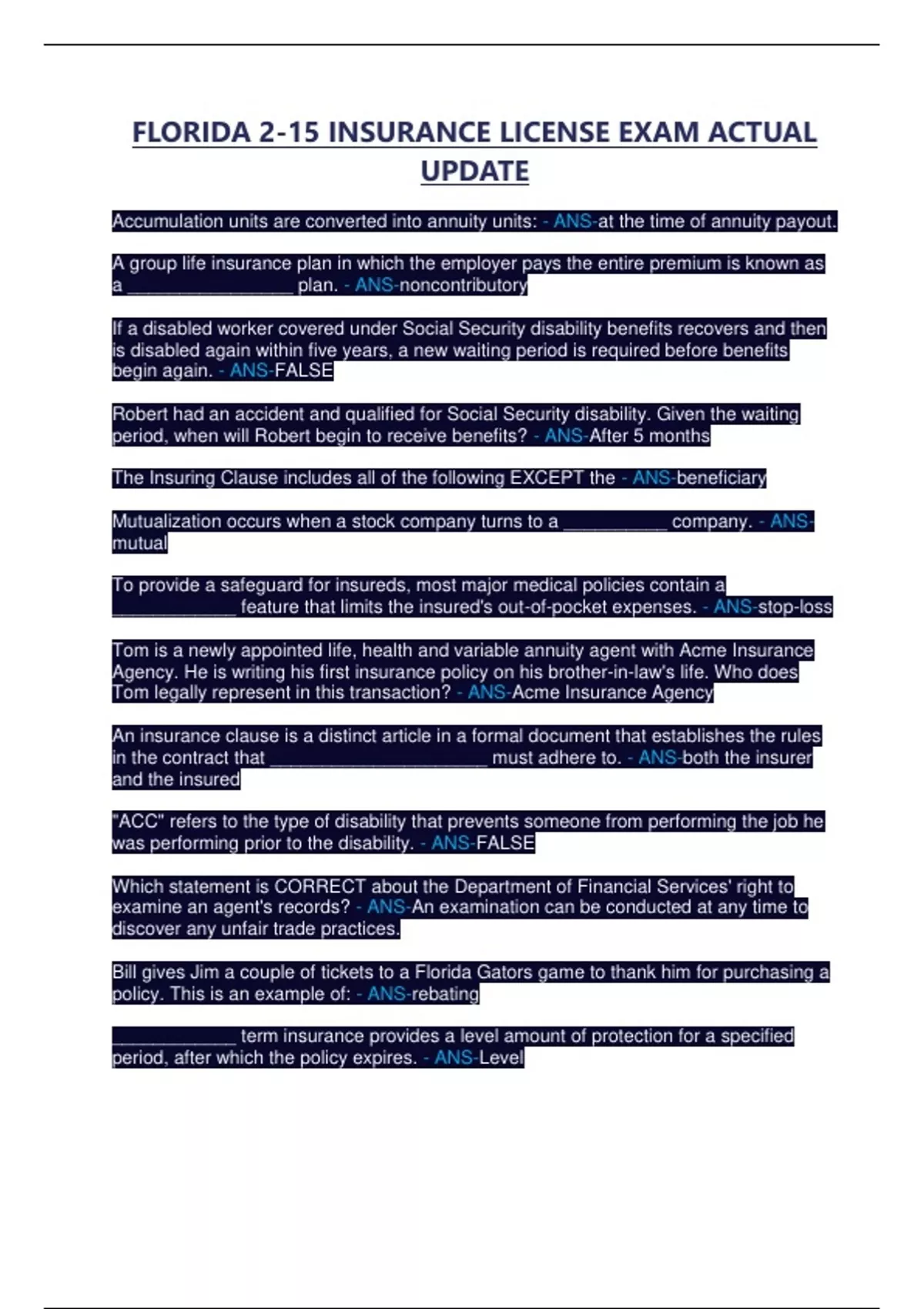 FLORIDA 2-15 INSURANCE LICENSE EXAM ACTUAL UPDATE