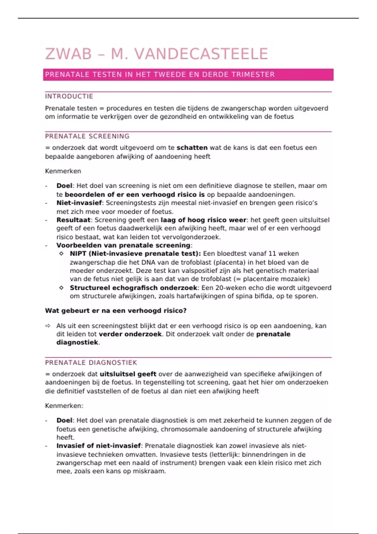 Prenatale testen = procedures en testen die tijdens de zwangerschap worden uitgevoerd