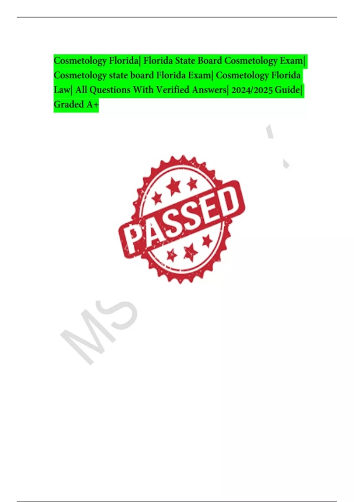 Cosmetology Florida| Florida State Board Cosmetology Exam| Cosmetology state board Florida Exam| Cosmetology Florida Law| All Questions With Verified Answers| 2024/2025 Guide| Graded A+