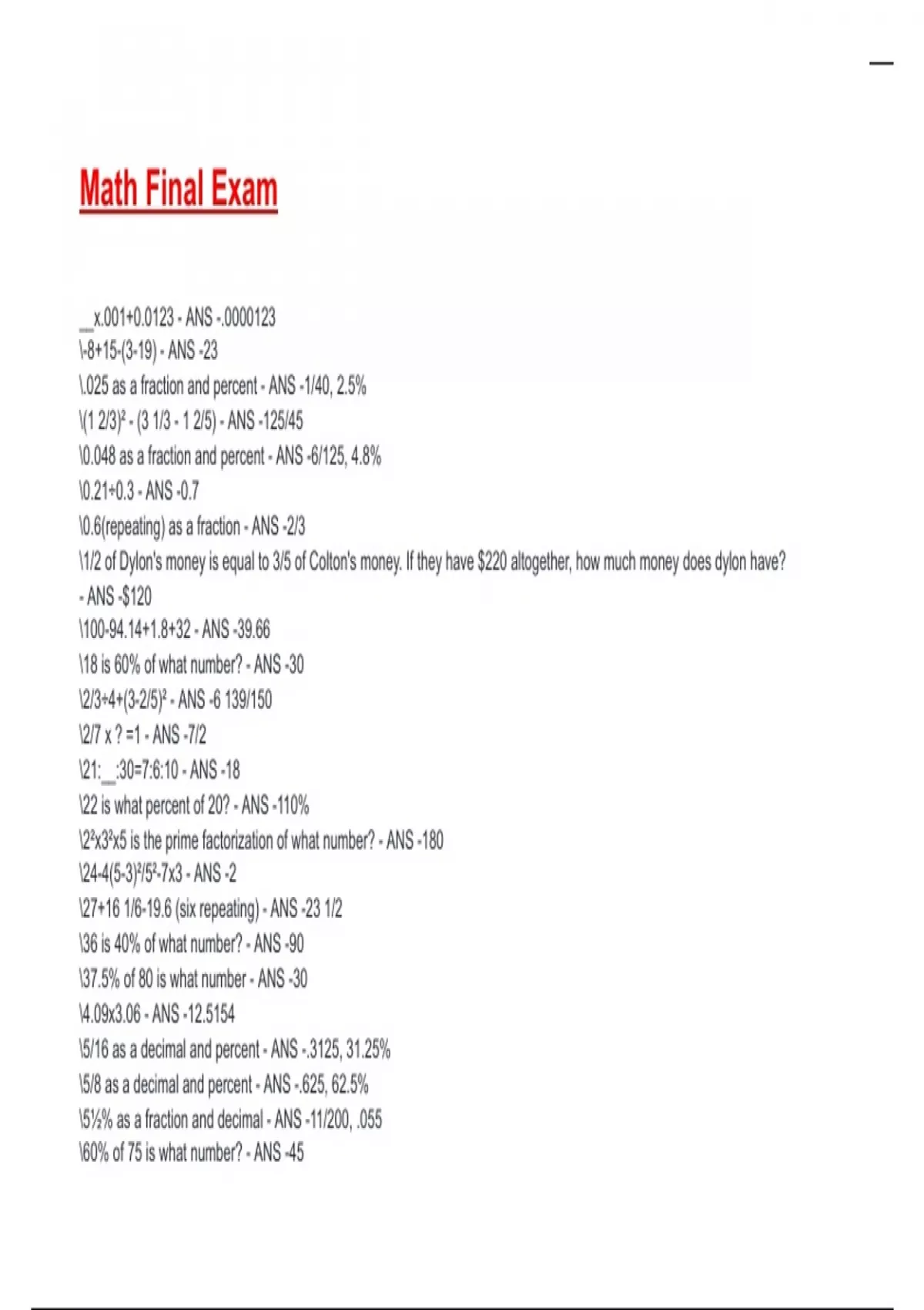 \5/8 as a decimal and percent - ANS -.625, 62.5%
