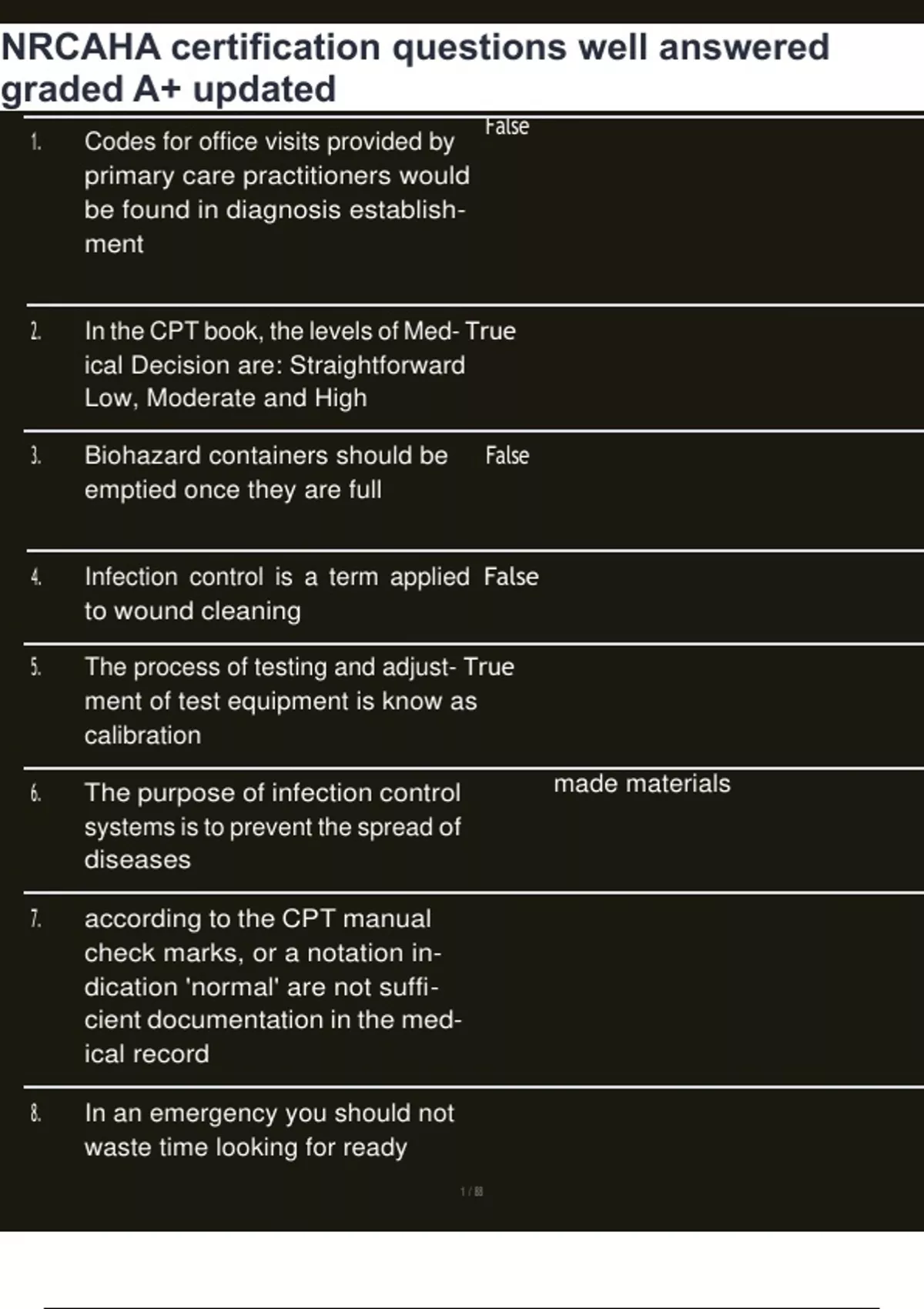 NRCAHA certification questions well answered graded A+ updated1. Codes for office visits provided by primary care practitioners would be found in diagnosis establish- ment False 2. In the CPT book, the levels of Med- True ical Decision are: Straightforward Low, Moderate and High 3. Biohazard containers should be emptied once they are full False 4. Infection control is a term applied False to wound cleaning 5. The process of testing and adjust- True ment of test equipment is know as calibration 6. The purpose of infection control systems is to prevent the spread of diseases 7. according to the CPT manual check marks, or a notation in- dication 'normal' are not suffi- cient documentation in the med- ical record 8. In an emergency you should not waste time looking for ready made materials True False False 9. If a patient has four or more chronic illnesses, but they are sta- ble then that disqualifies them as a factor in determining the level of medical decision making 10. First class mail is the most used class in a medical office 11. Hands should be washed with soup and warm water immedi- ately after providing care, even if gloves were worn 12. a policy and procedure manual should include the diagnosis that the doctor deals with 13. The best method of scheduling appointments differs from office to office depending on the goals of the physician and staff 14. The most effective tool that the medical office can have as a guid- ing principle of maintaining high standards is a good office manag- er 15. A description of the steps that should be utilized to handle a spe- cific situation or to perform a cer-