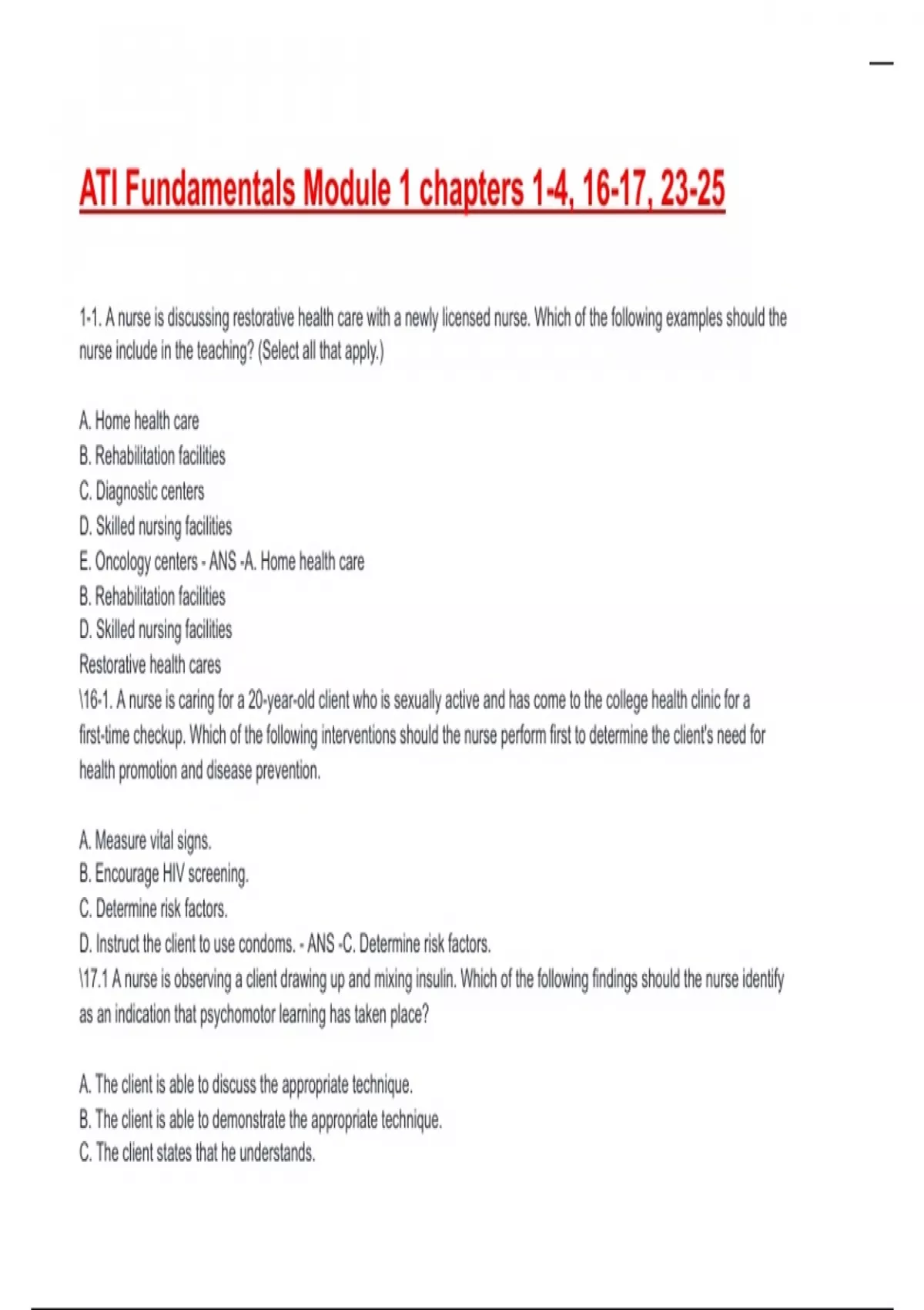 1-1. A nurse is discussing restorative health care with a newly licensed nurse. Which of the following examples should the