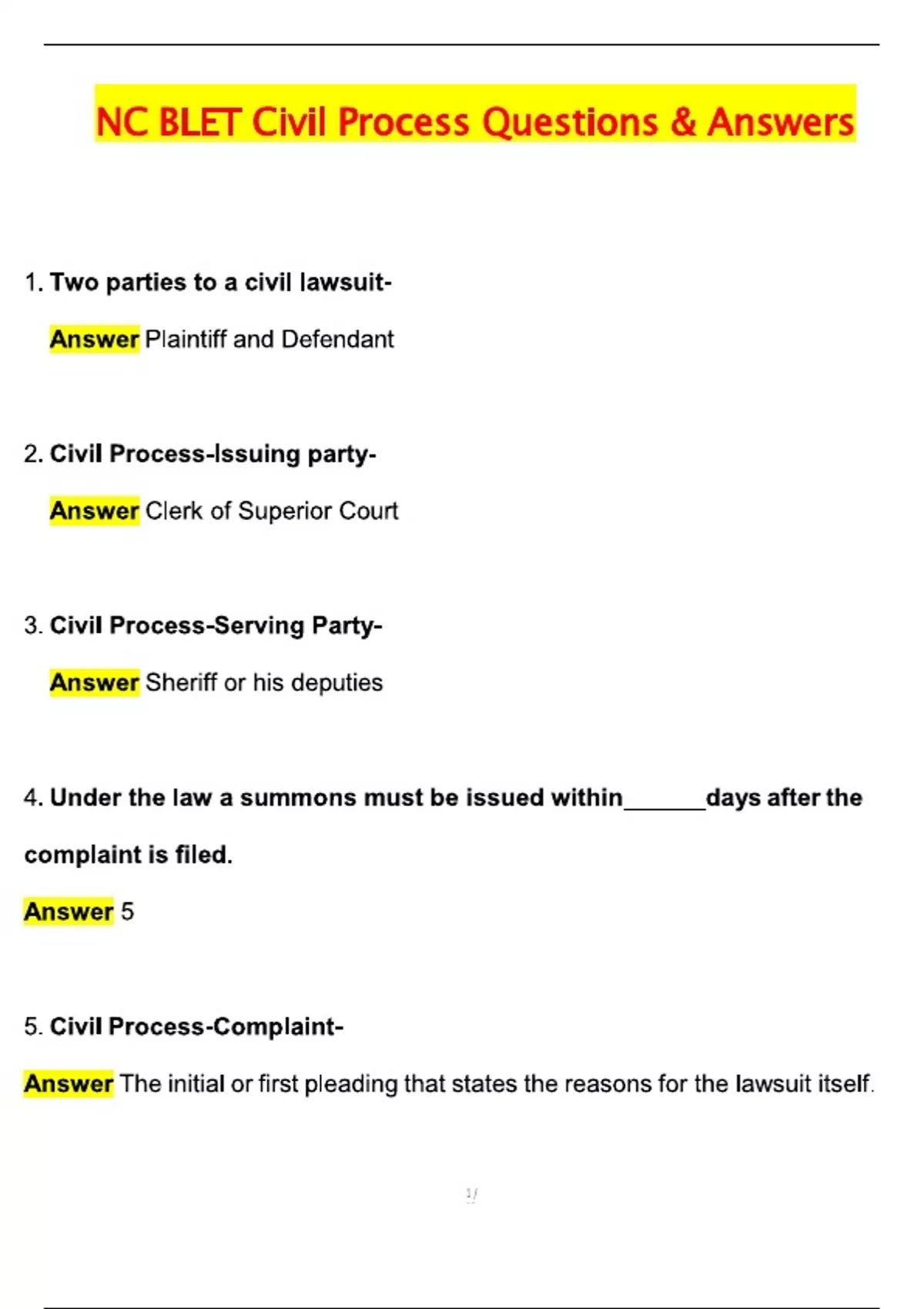 2025 NC BLET Civil Process (Latest 2025 / 2026 Update) Questions and Verified Answers | 100% Correct | Grade A+