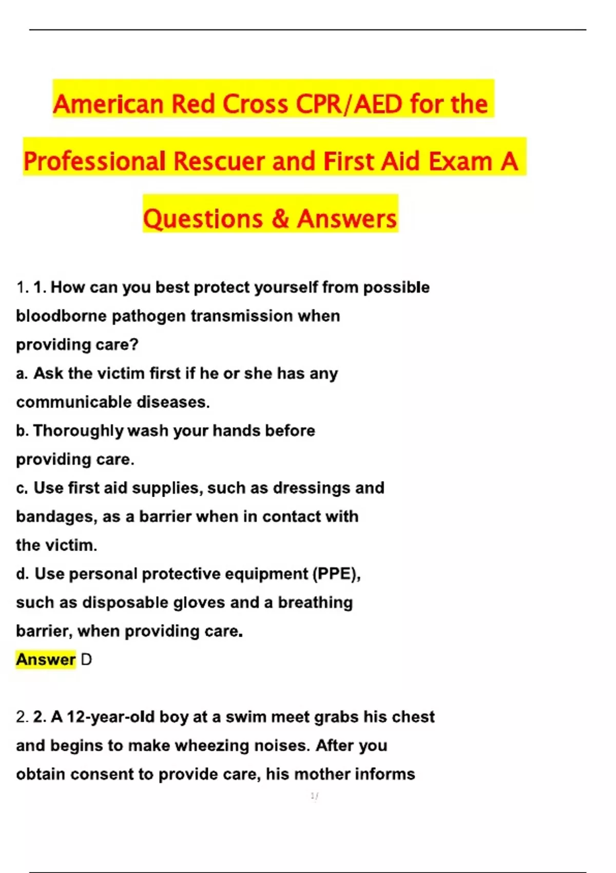 American Red Cross CPR AED for the Professional Rescuer & First Aid Exam A (Latest 2025 / 2026 Update) Questions and Verified Answers | 100% Correct | Grade A+. American Red Cross EMR test questions 2025 update. Latest CPR AED First Aid exam answers American Red Cross. BLS certification practice test American Red Cross 2026. American Red Cross Lifeguarding Skills final exam study guide. CPR AED recertification exam American Red Cross online. American Red Cross Lifeguarding Test free practice questions. First Aid CPR AED health packet answers verified 2025. American Red Cross Instructor IT recertification exam tips. Grade A American Red Cross exam preparation resources. American Red Cross all exams study materials PDF download. 100% correct American Red Cross test answers 2026 version. American Red Cross EMR certification exam simulator. CPR AED First Aid final written exam practice American Red Cross. BLS renewal exam American Red Cross updated questions. Lifeguarding Skills final exam A American Red Cross cheat sheet. American Red Cross CPR AED test bank with explanations. Lifeguarding Test CPR First Aid American Red Cross flashcards. American Red Cross First Aid certification exam prep course. Instructor IT recertification assessment exams American Red Cross. American Red Cross all exams fully covered study package. Latest American Red Cross test questions and verified answers. American Red Cross certification exams 2025 update PDF. Free instant download American Red Cross exam materials. American Red Cross all certifications exam bundle 2026. Grade A guaranteed American Red Cross exam preparation guide