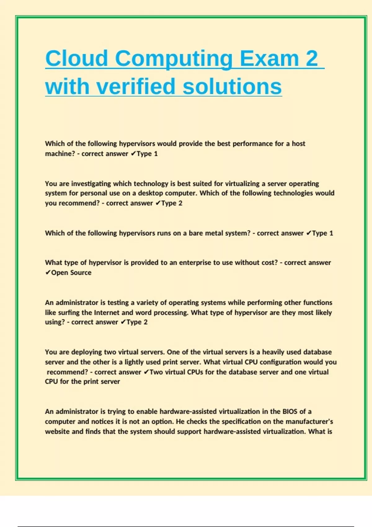 Which of the following hypervisors runs on a bare metal system? - correct answer ✔Type 1