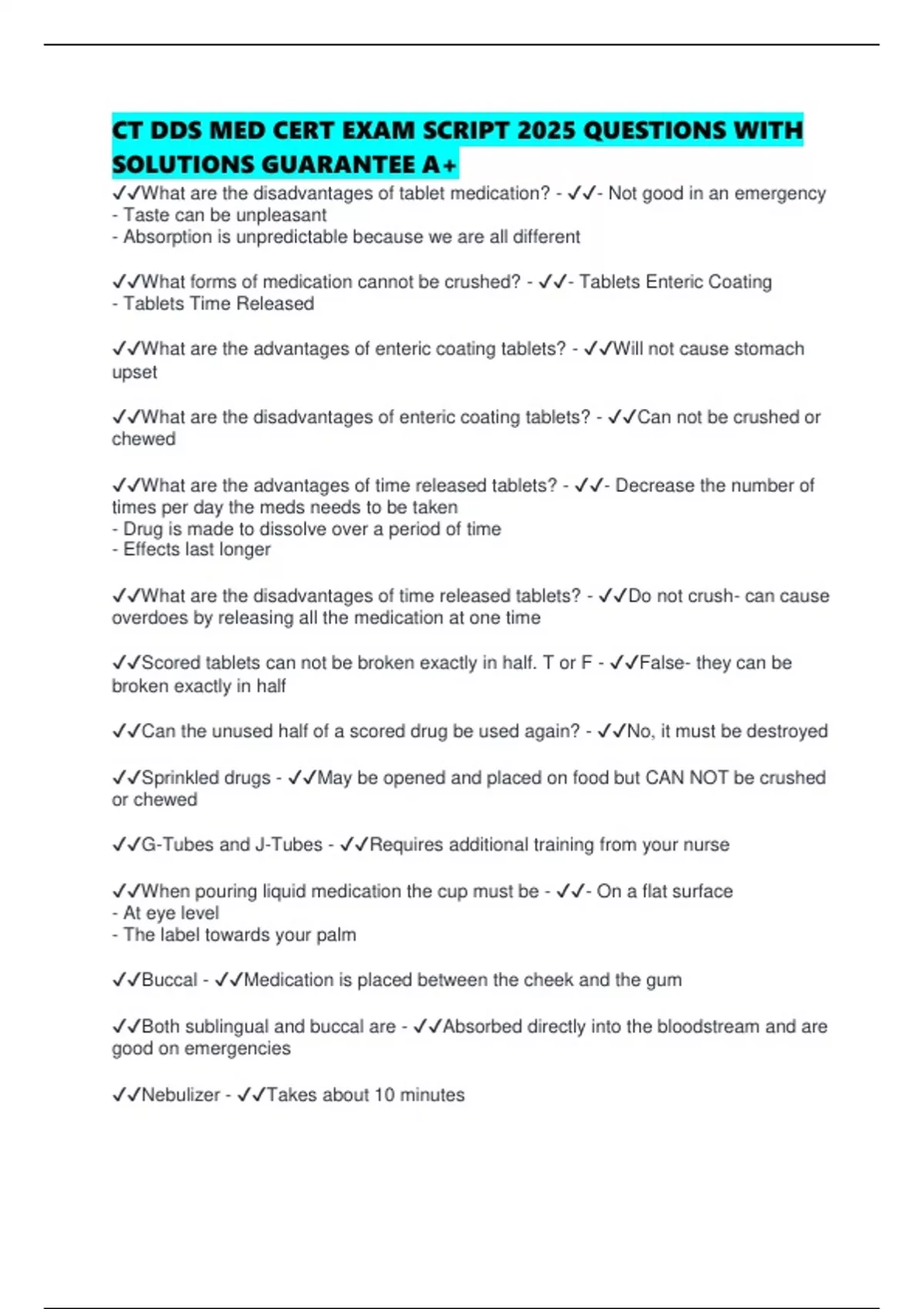 CT DDS MED CERT EXAM SCRIPT 2025 QUESTIONS WITH SOLUTIONS GUARANTEE A+ What are the disadvantages of tablet medication? - - Not good in an emergency - Taste can be unpleasant - Absorption is unpredictable because we are all different What forms of medication cannot be crushed? - - Tablets Enteric Coating - Tablets Time Released What are the advantages of enteric coating tablets? - Will not cause stomach upset What are the disadvantages of enteric coating tablets? - Can not be crushed or chewed What are the advantages of time released tablets? - - Decrease the number of times per day the meds needs to be taken - Drug is made to dissolve over a period of time - Effects last longer