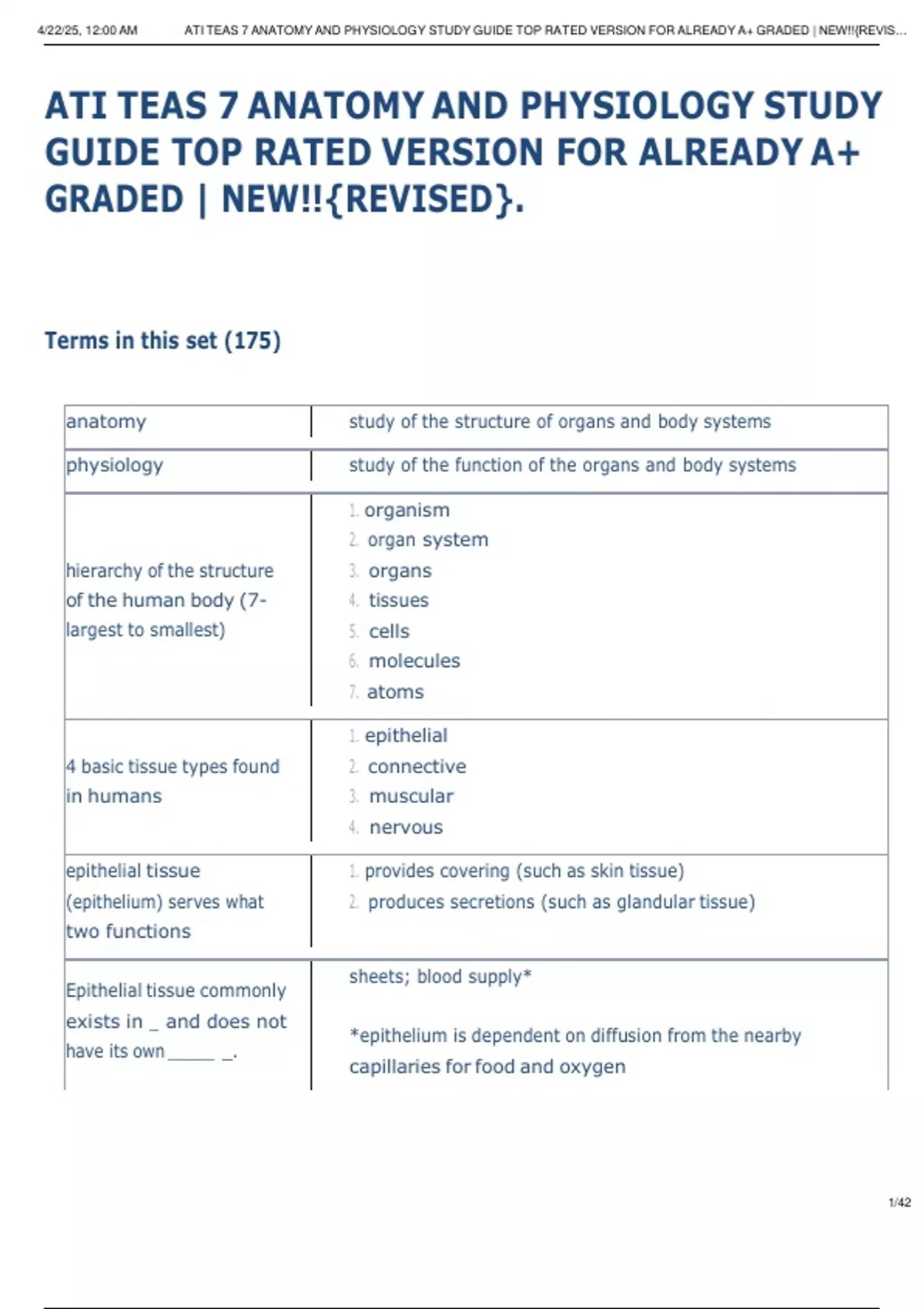 , 4/22/25, 12:00 AM ATI TEAS 7 ANATOMY AND PHYSIOLOGY STUDY GUIDE TOP RATED VERSION FOR ALREADY A+ GRADED | NEW!!{REVIS…