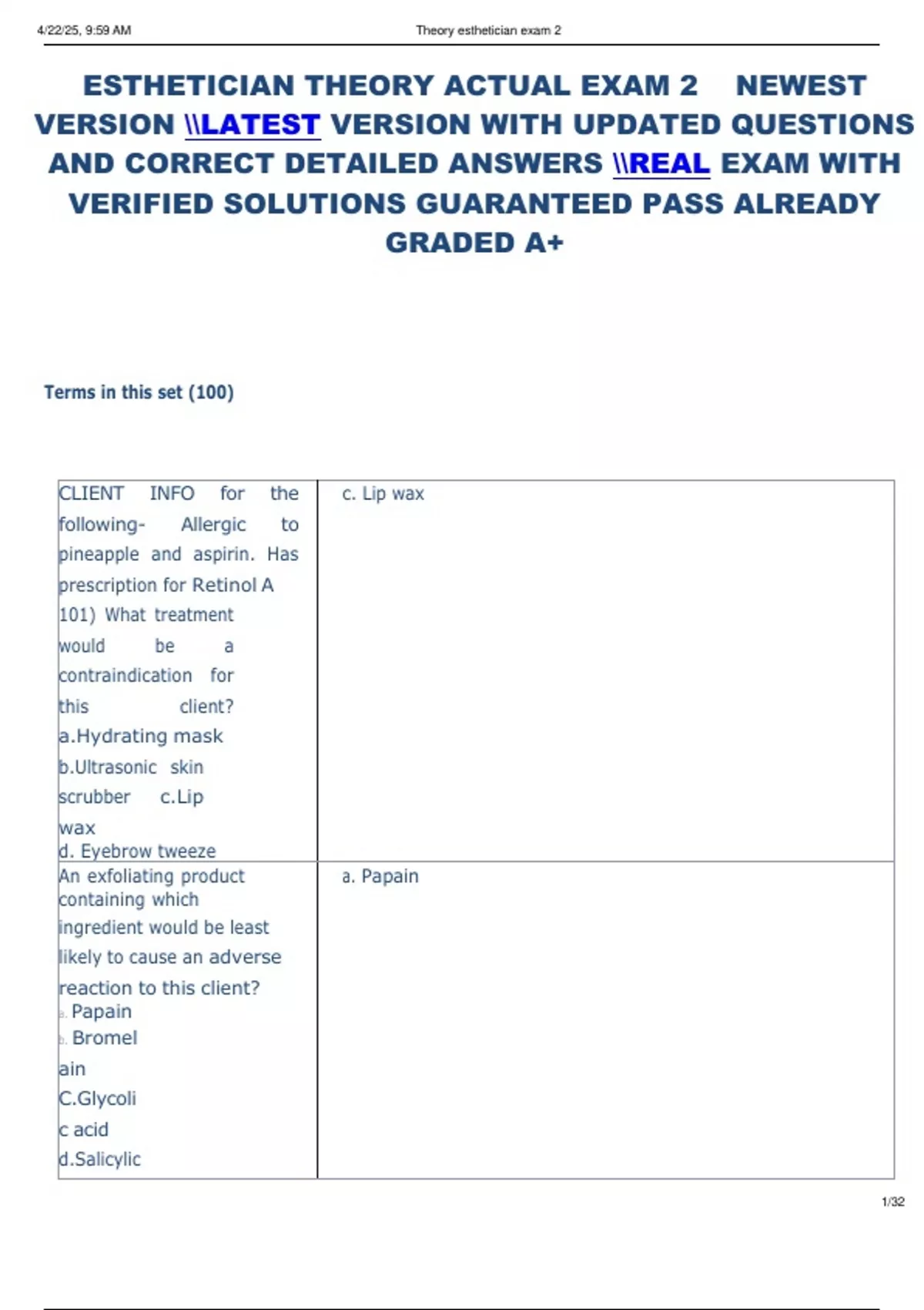 ESTHETICIAN THEORY ACTUAL EXAM 2 NEWEST