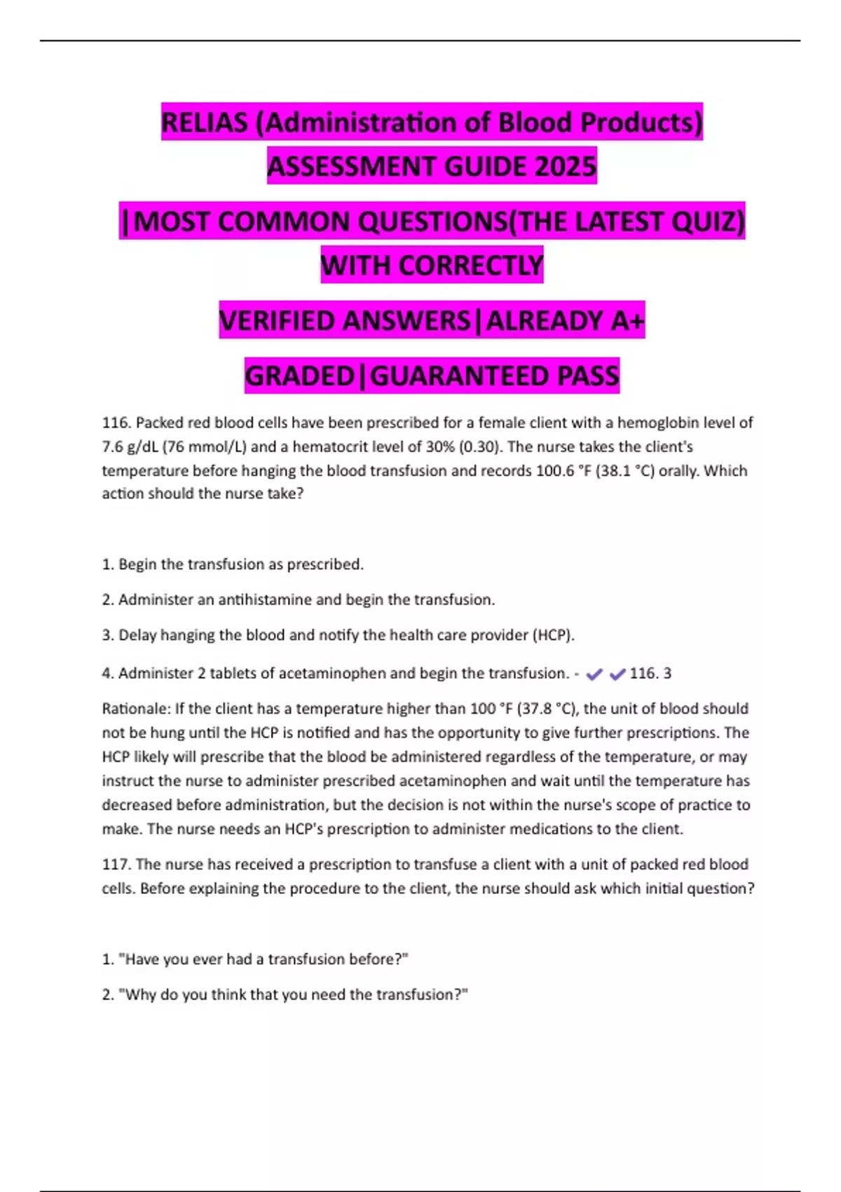117. The nurse has received a prescription to transfuse a client with a unit of packed red blood
