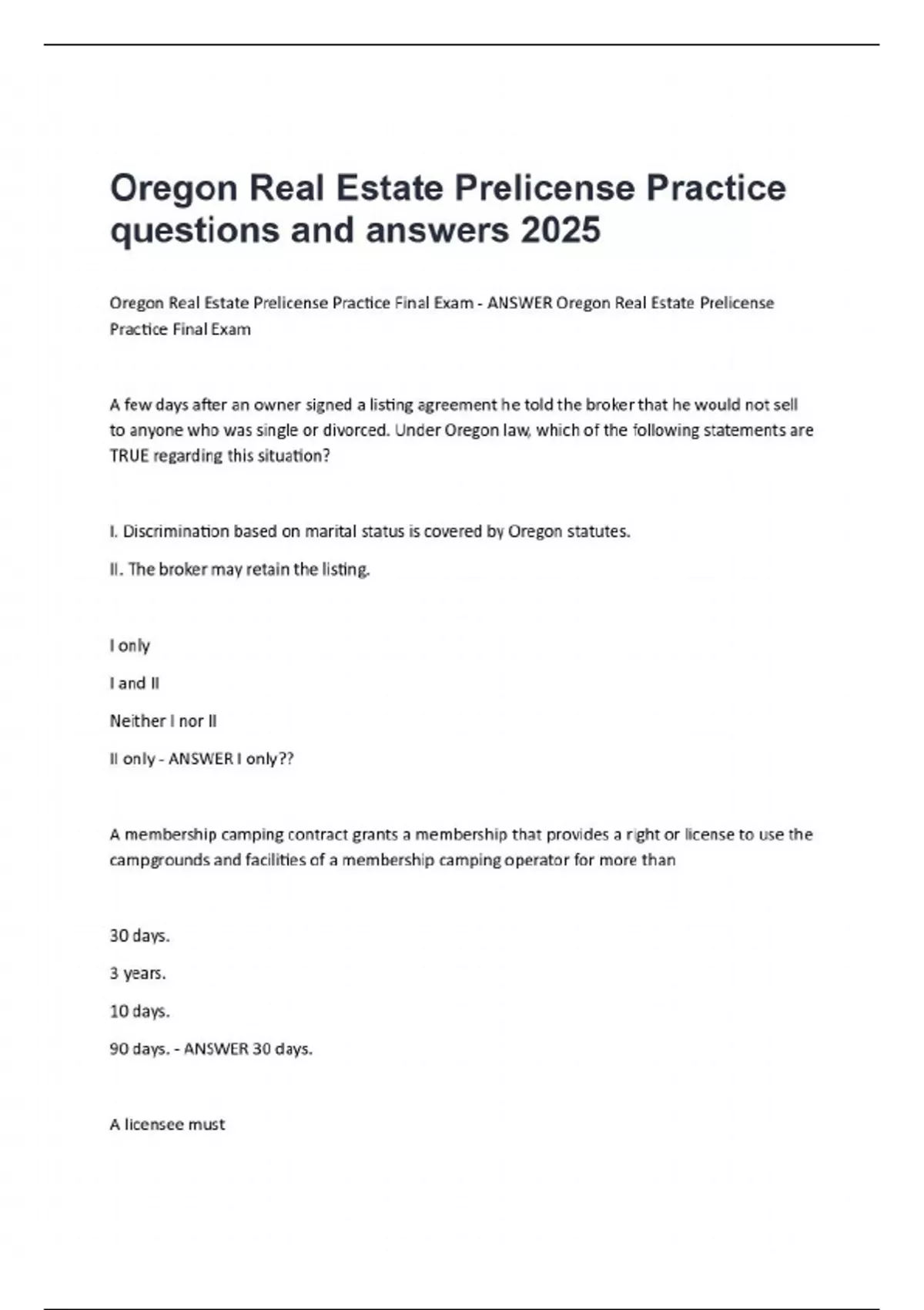 Oregon Real Estate Prelicense Practice questions and answers 2025