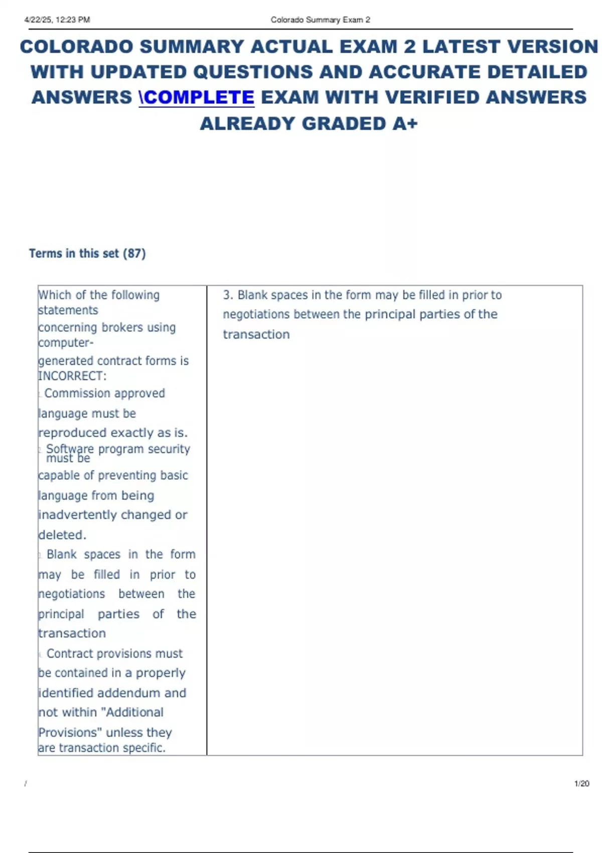 COLORADO SUMMARY ACTUAL EXAM 2 LATEST VERSION