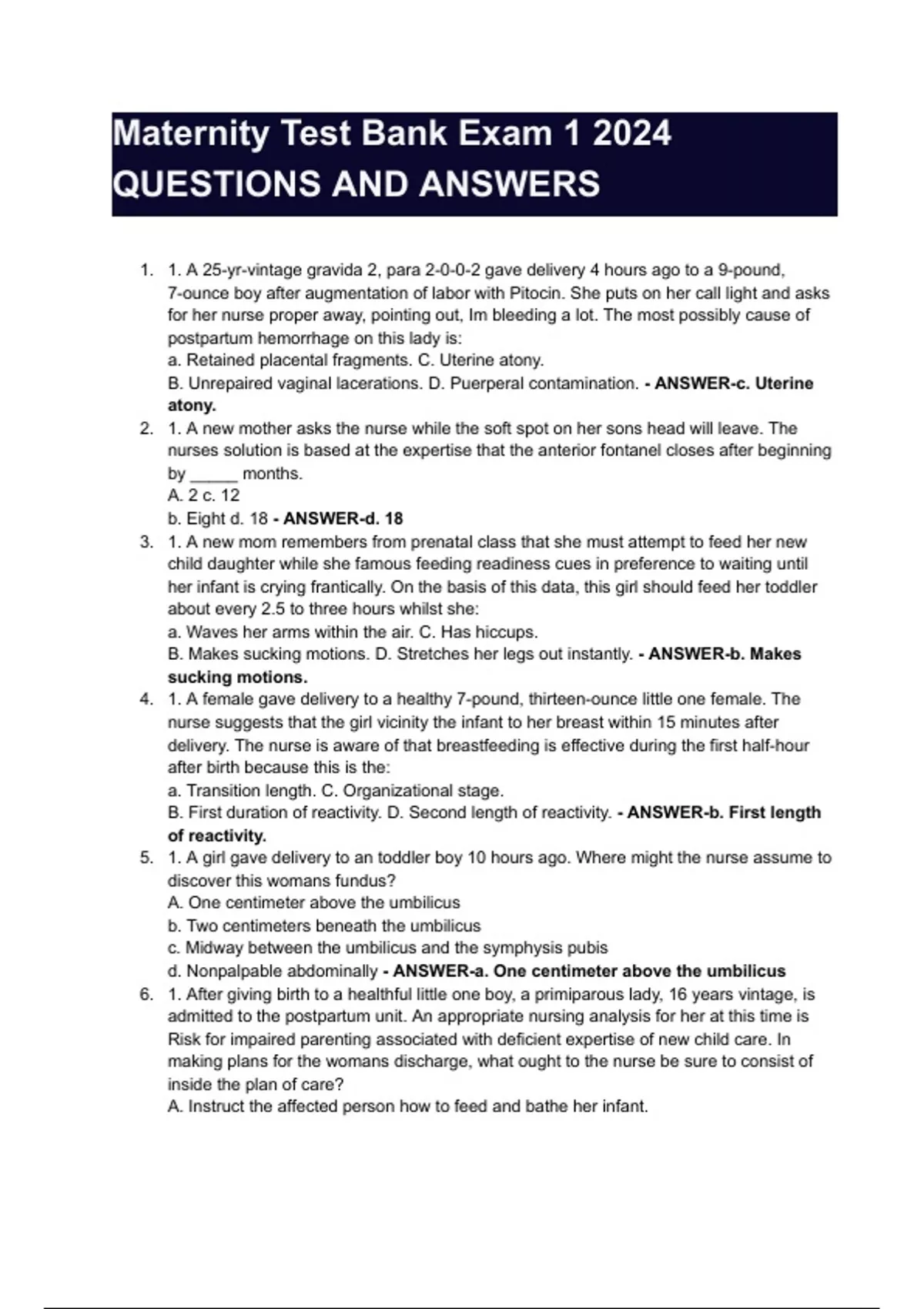 Maternity Test Bank Exam 1 2024 QUESTIONS AND ANSWERS