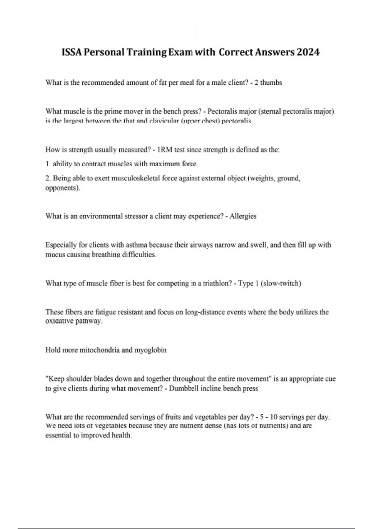 What is the appropriate protein portion for men? - 2 palms. If you are looking to add some lean mass, add an extra thumb of fat or another cupped handful of carbs for a few meals. Which type of contraction allows the muscles to "activate" but have no movement or change in muscle length? - Isometric contraction. Exercises include: wall-sit, plank, A client thinks they injured their shoulder, what should the trainer do? - Refer them to a doctor. Personal trainers/fitness peeps are not qualified to diagnose injuries. All activities begin in which energy pathway? - ATP/CP pathway. Doesn't matter how long or how intense the activity is, every activity starts here. Myosin ATPase cuts off a phosphate molecule from ATP and uses it for releasing energy. What is the most superficial (closest to the surface) muscle of the abdominals. - External obliques Utilizing the FITT principle, how many times a week should a beginner client workout for? - 3 times a week. This principle works best for beginners because it will show them how to get started. What is responsible for sensing excessive stretch to protect the muscle? - Muscle spindle. Cycling your training to help account for shock, compensation, and exhaustion is an important part of periodization and refers to which principle? - The GAS principle. 1. "Alarm stage" applying intense training stress. 2. "Resistance stage" muscles evolve and adapt to handling heavier loads and resist stressful weights more easily and effectively. 3. "Exhaustion stage" continually adding stress will exhaust our reserves and will cease to function at peak performance.