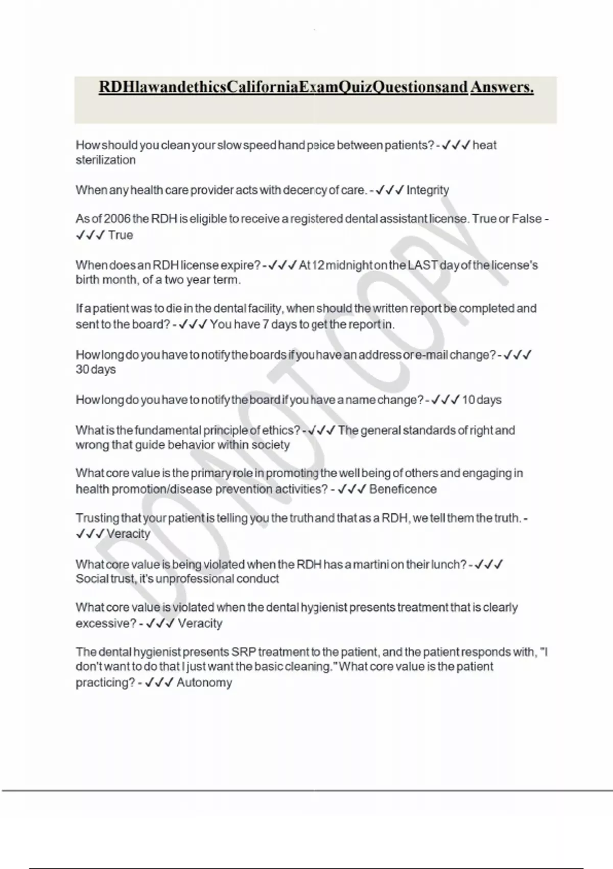 How should you clean your slow speed hand peice between patients? - heat sterilization When any health care provider acts with decency of care. - Integrity As of 2006 the RDH is eligible to receive a registered dental assistant license. True or False - True When does an RDH license expire? - At 12 midnight on the LAST day of the license's birth month, of a two year term. If a patient was to die in the dental facility, when should the written report be completed and sent to the board? - You have 7