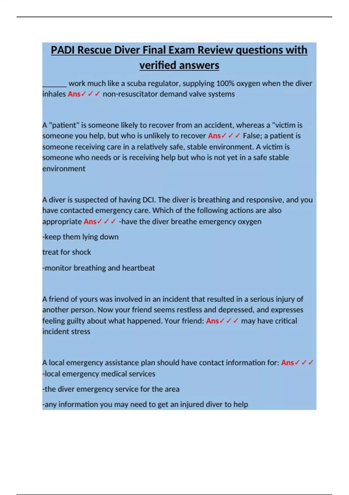 PADI Rescue Diver Final Exam Review questions with verified answers.