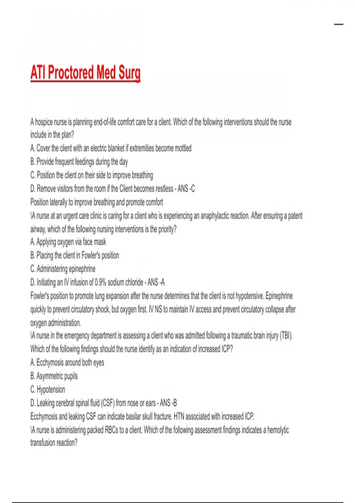 Fowler's position to promote lung expansion after the nurse determines that the client is not hypotensive. Epinephrine