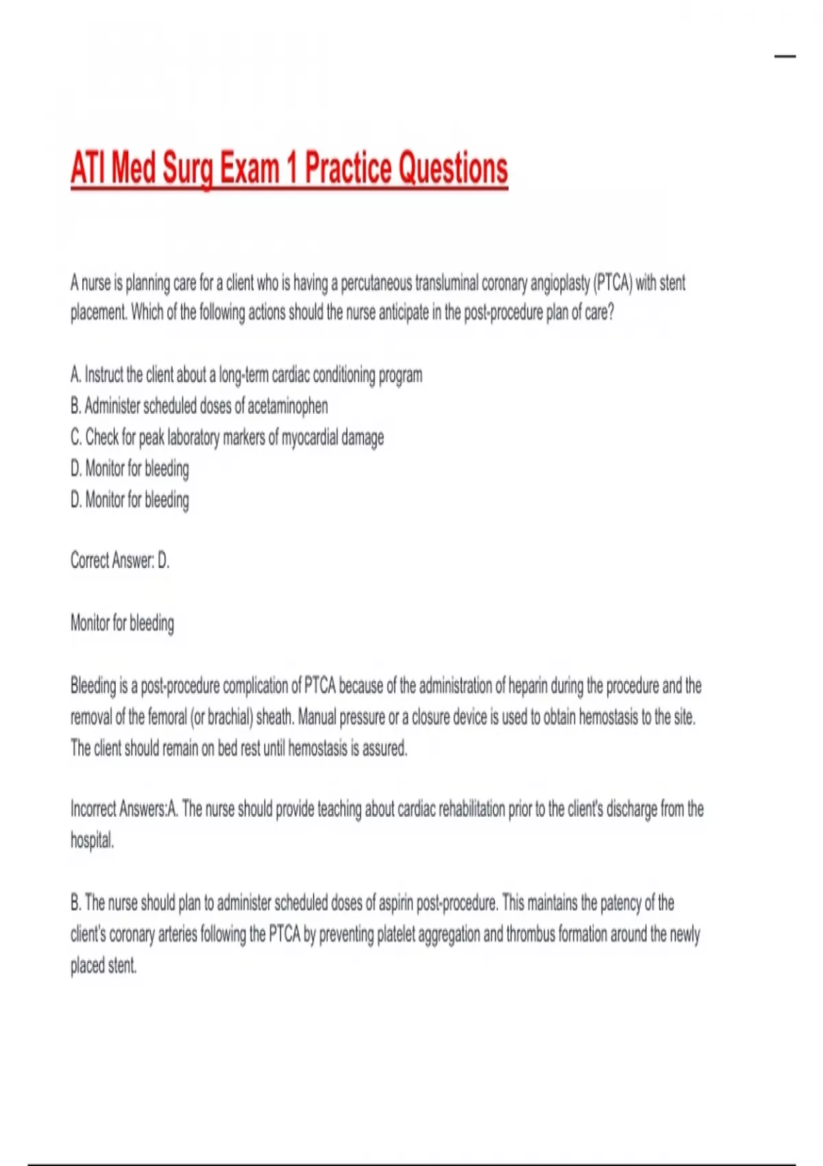 A nurse is planning care for a client who is having a percutaneous transluminal coronary angioplasty (PTCA) with stent