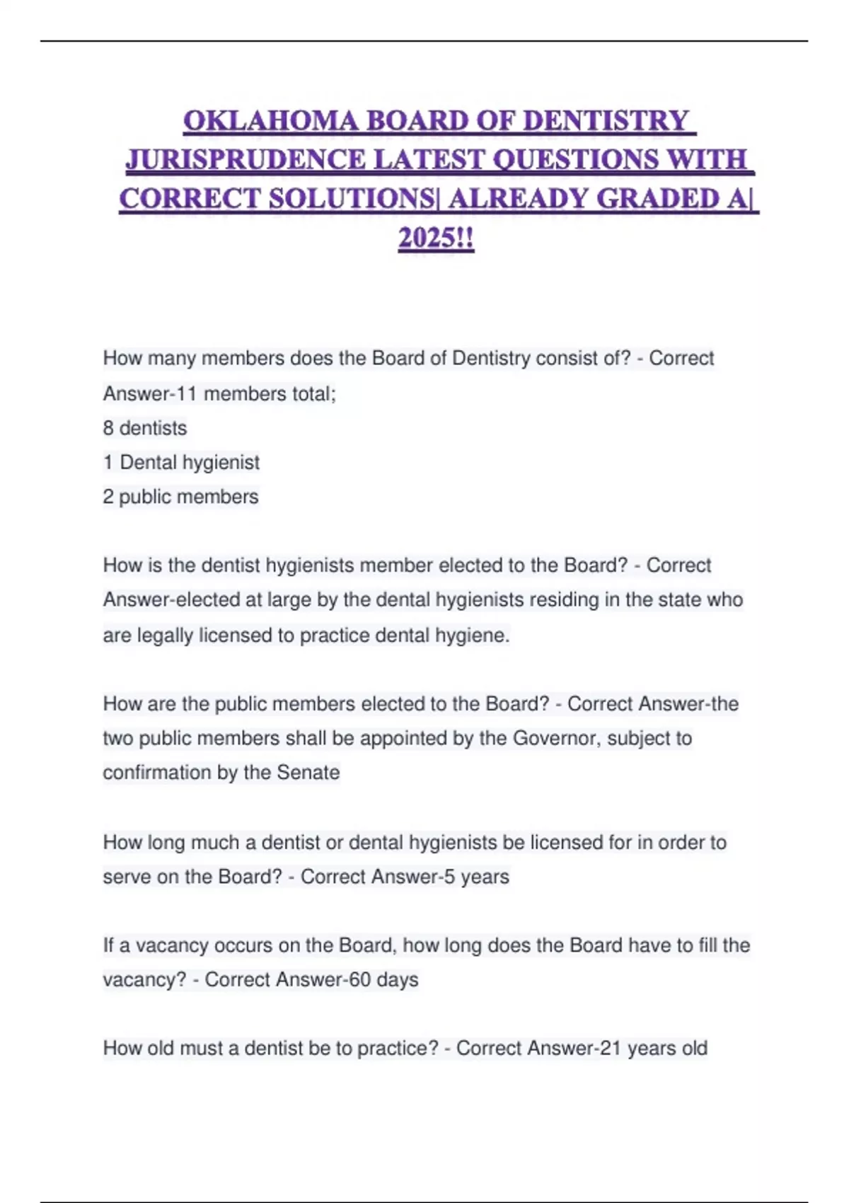 OKLAHOMA BOARD OF DENTISTRY JURISPRUDENCE LATEST QUESTIONS WITH CORRECT SOLUTIONS| ALREADY GRADED A| 2025!! How many members does the Board of Dentistry consist of? - Correct Answer-11 members total; 8 dentists 1 Dental hygienist 2 public members How is the dentist hygienists member elected to the Board? - Correct Answer-elected at large by the dental hygienists residing in the state who are legally licensed to practice dental hygiene. How are the public members elected to the Board? - Correct Answer-the two public members shall be appointed by the Governor, subject to confirmation by the Senate