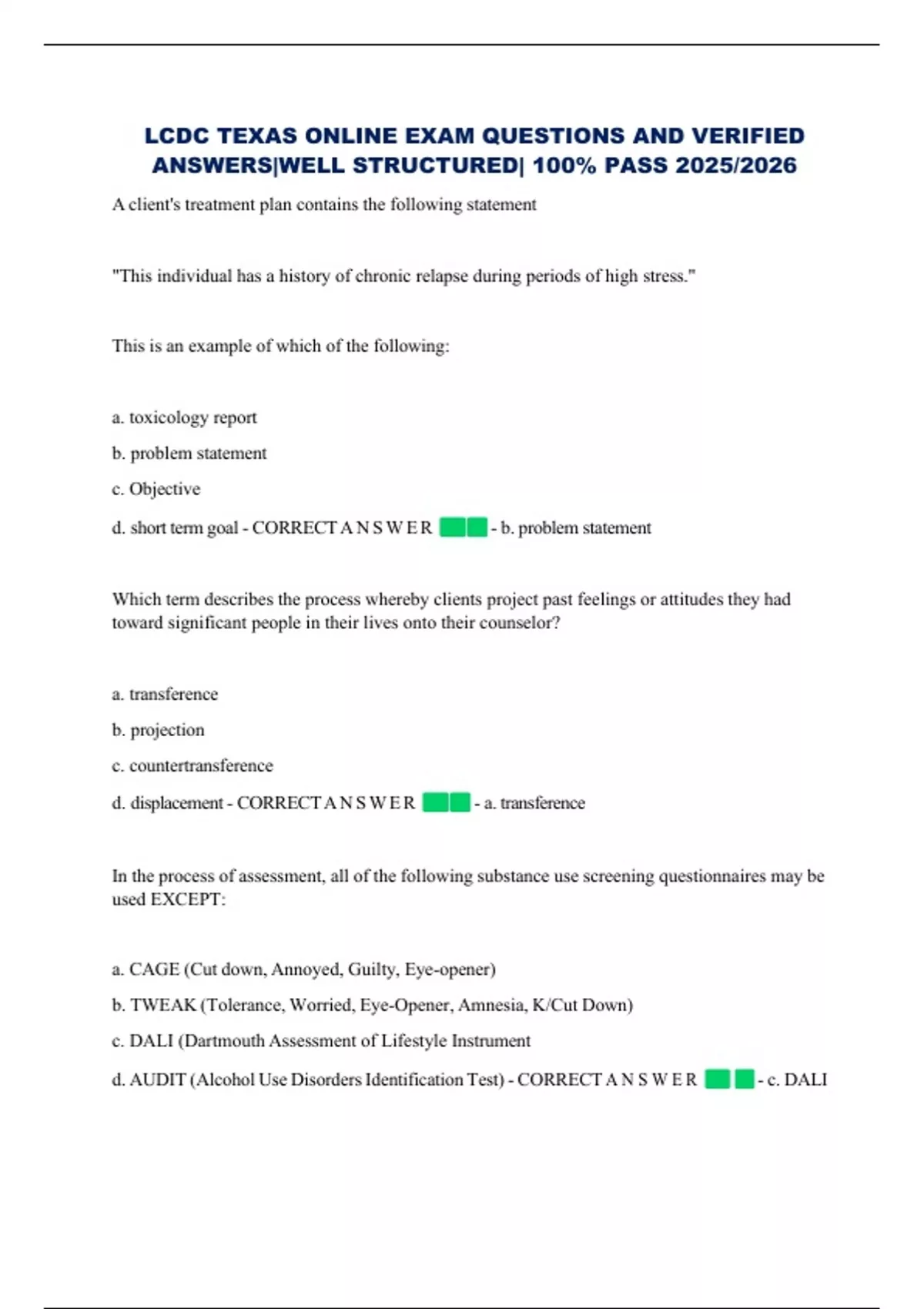 LCDC TEXAS ONLINE EXAM QUESTIONS AND VERIFIED