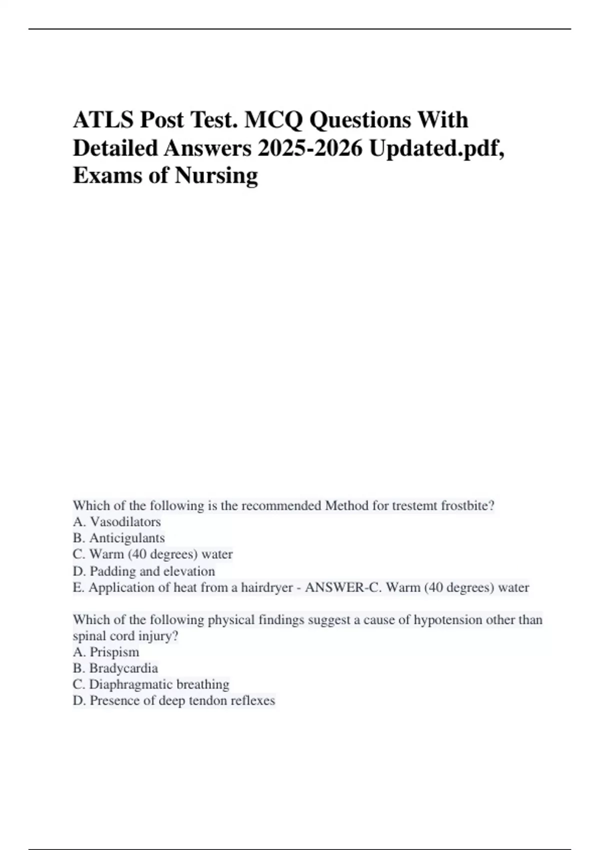 ATLS Post Test. MCQ Questions With Detailed Answers U, Exams of Nursing Which of the following is the recommended Method for trestemt frostbite? A. Vasodilators B. Anticigulants C. Warm (40 degrees) water D. Padding and elevation E. Application of heat from a hairdryer - ANSWER-C. Warm (40 degrees) water Which of the following physical findings suggest a cause of hypotension other than spinal cord injury? A. Prispism B. Bradycardia C. Diaphragmatic breathing D. Presence of deep tendon reflexes E. Ability to flex forearms but not extend them - ANSWER-D. Presence of deep tendon reflexes. Spinal shock refers to loss of muscle toe (flaccidty) and loss of reflexes. The primary indication for transferring A patient to a higher level trauma center is: A. Unavailibility of surgeon or operating staff B. Multiple system injuries, including severe head injury C. Resource limitations as determined by the transferring doctor D. Resource limitations as determined by the hospital administration E. Widened mediastinum on chest x-ray following blunt trauma - ANSWER-C. Resource limitations as determined by the transferring doctor (MÅ SJEKKES)