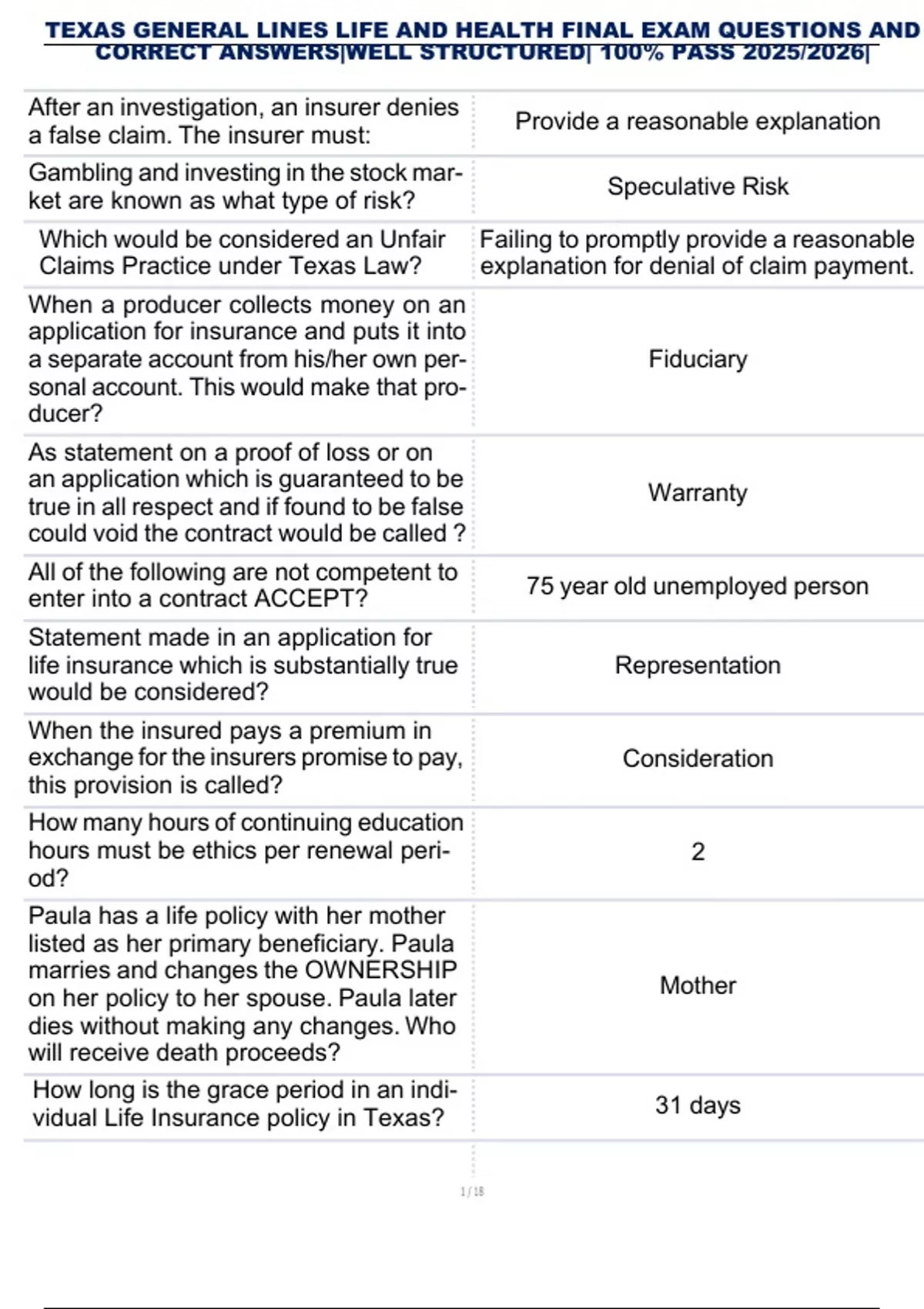 TEXAS GENERAL LINES LIFE AND HEALTH FINAL EXAM QUESTIONS AND