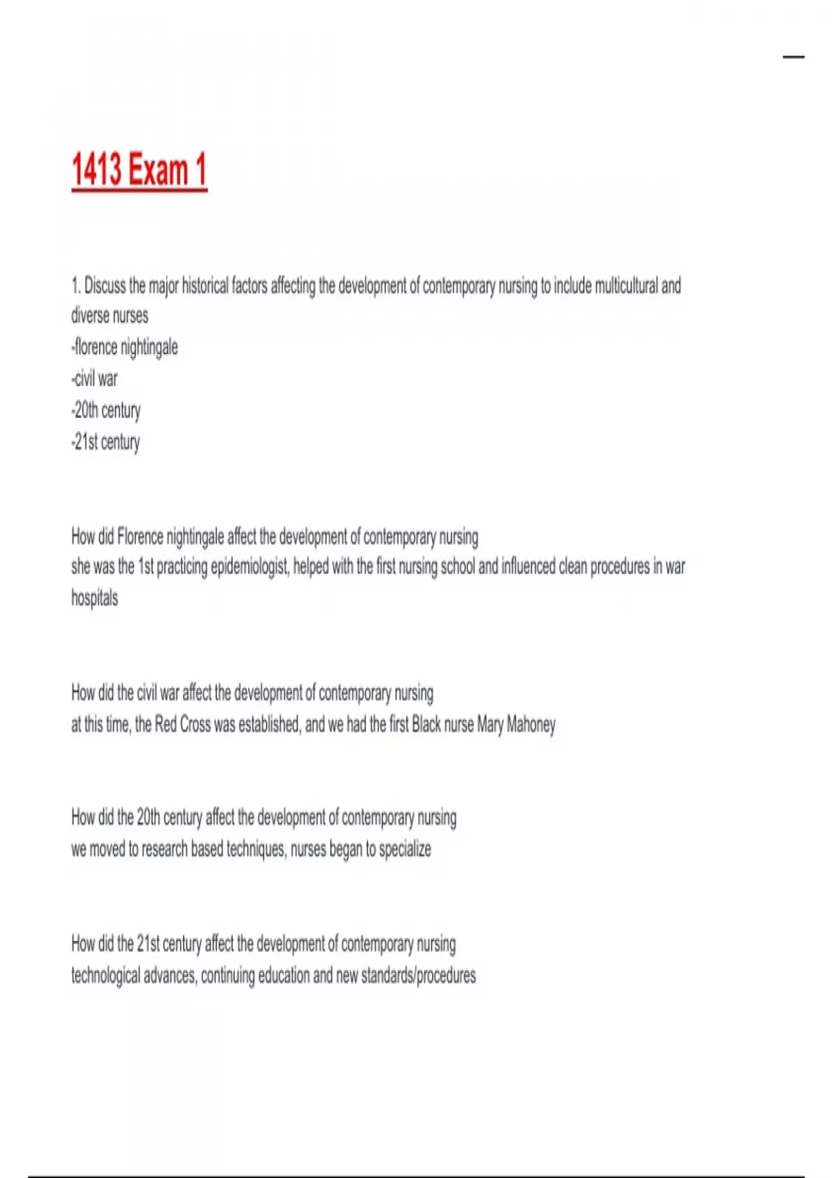 1. Discuss the major historical factors affecting the development of contemporary nursing to include multicultural and