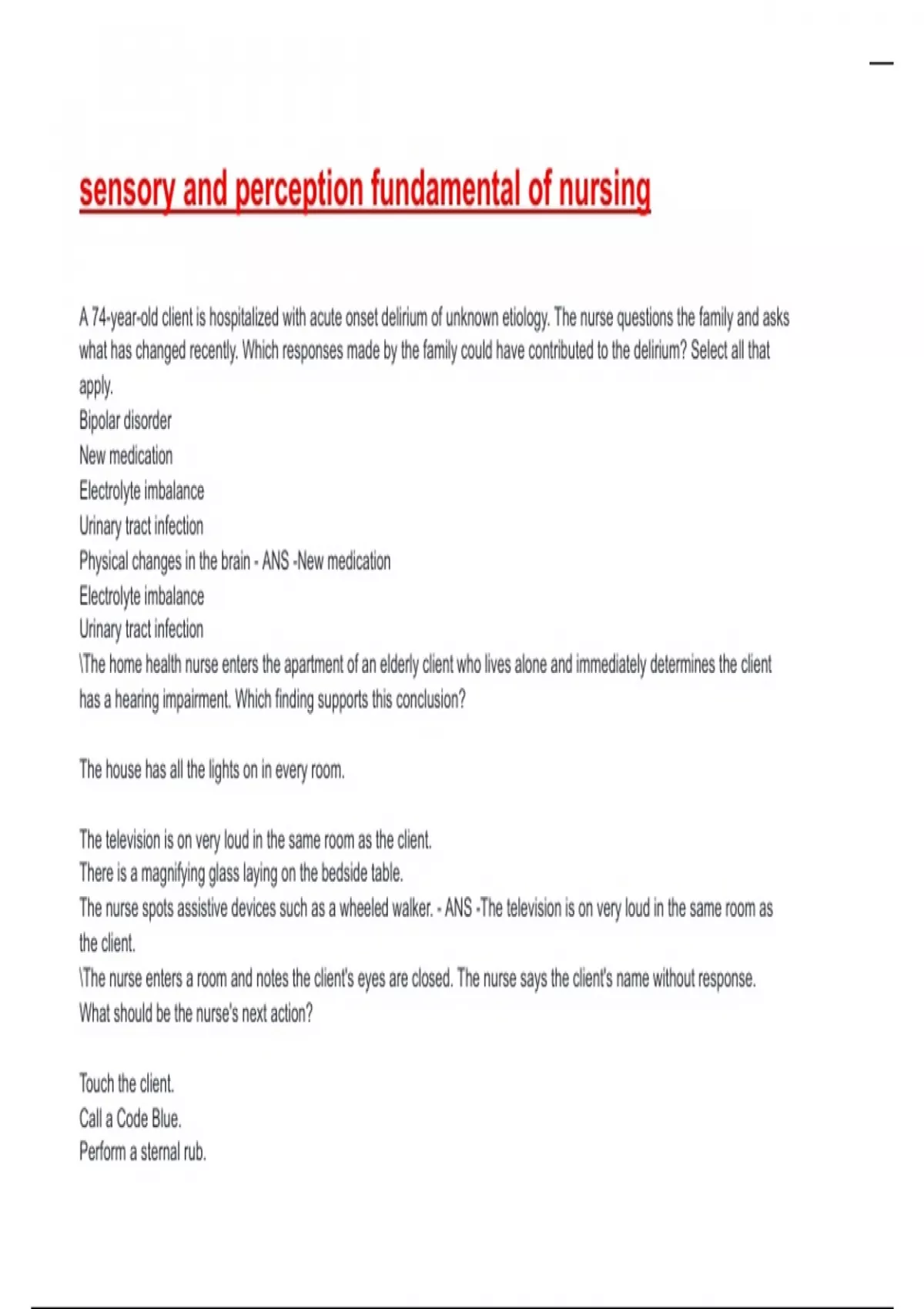 \The nurse enters a room and notes the client's eyes are closed. The nurse says the client's name without response.