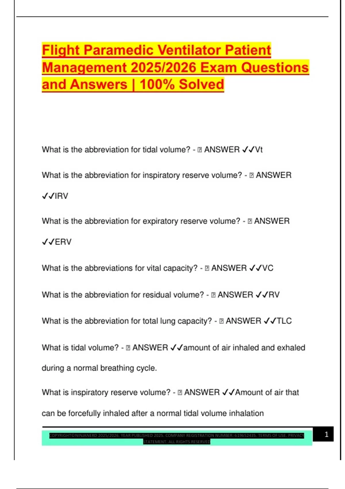 Flight Paramedic Ventilator Patient Management 2025/2026 Exam Questions and Answers | 100% Solved