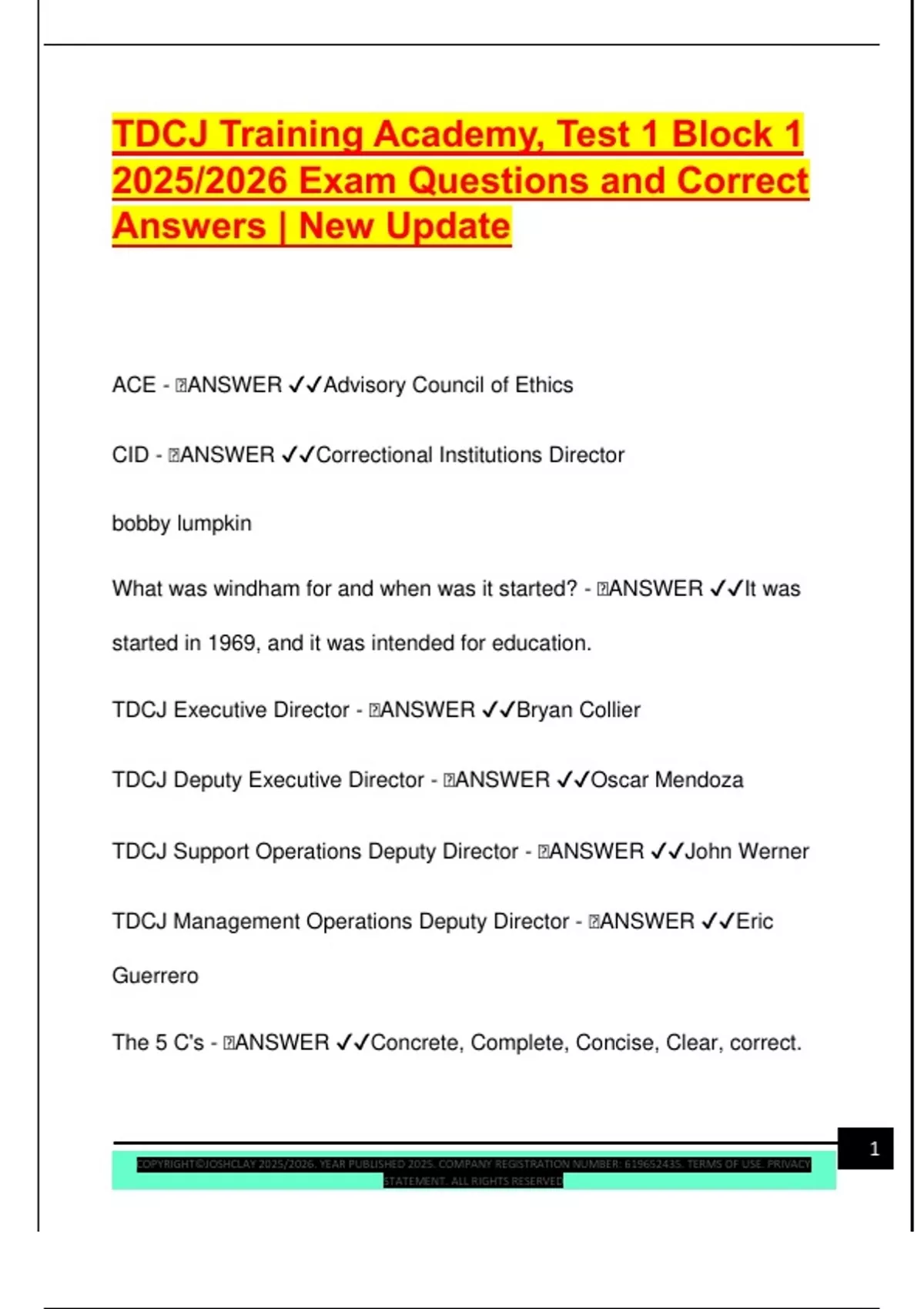 TDCJ Training Academy, Test 1 Block 1 2025/2026 Exam Questions and Correct Answers | New Update ACE -