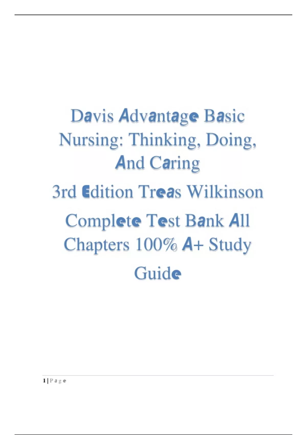 Davis Advantage Basic Nursing: Thinking, Doing, And Caring 3rd Edition Treas Wilkinson Complete Test Bank All Chapters 100% A+ Study Guide