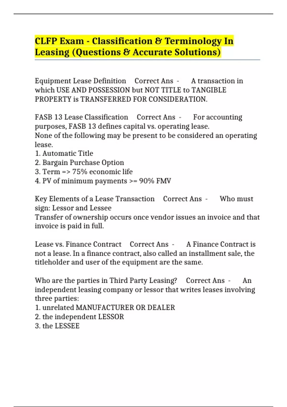 CLFP Exam - Classification & Terminology In Leasing (Questions & Accurate Solutions)