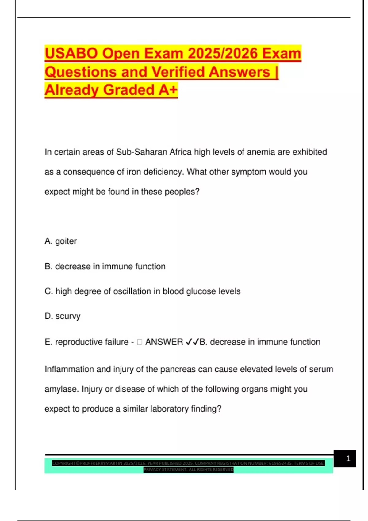 USABO Open Exam 2025/2026 Exam Questions and Verified Answers | Already Graded A+ In certain areas of Sub-Saharan Africa high levels of anemia are exhibited as a consequence of iron deficiency. What other symptom would you expect might be found in these peoples? A. goiter B. decrease in immune function C. high degree of oscillation in blood glucose levels D. scurvy E. reproductive failure -