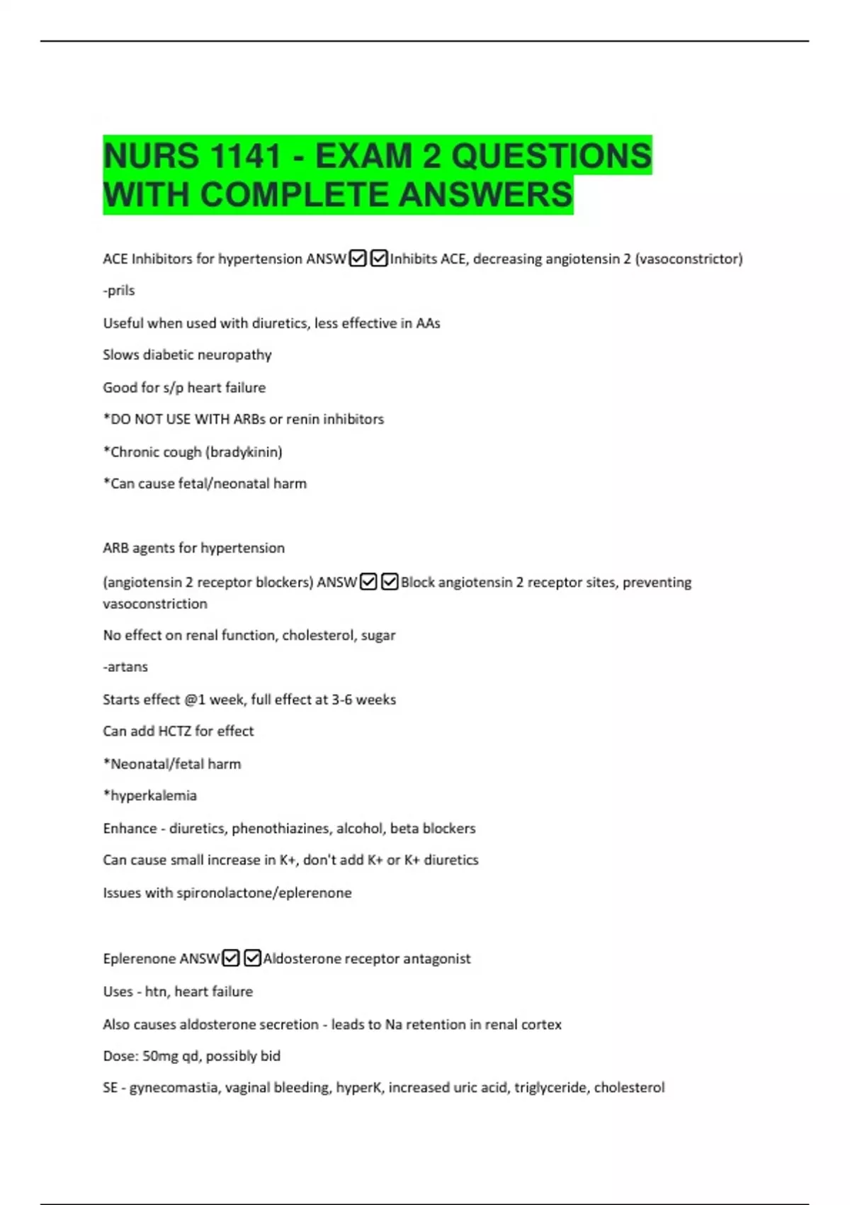 NURS 1141 - EXAM 2 QUESTIONS WITH COMPLETE ANSWERS ACE Inhibitors for hypertension ANSWInhibits ACE, decreasing angiotensin 2 (vasoconstrictor) -prils Useful when used with diuretics, less effective in AAs Slows diabetic neuropathy Good for s/p heart failure *DO NOT USE WITH ARBs or renin inhibitors *Chronic cough (bradykinin) *Can cause fetal/neonatal harm