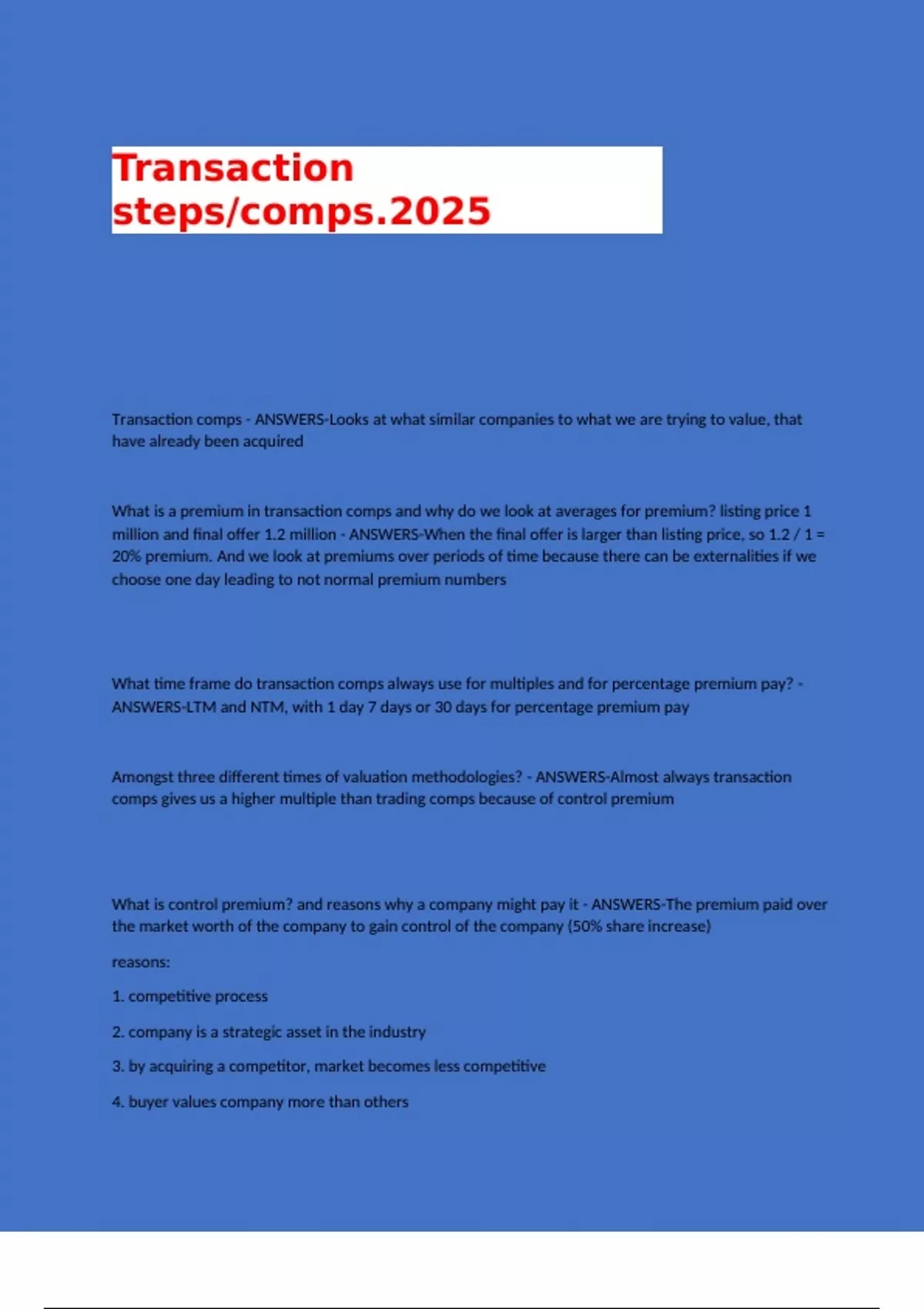 Transaction comps - ANSWERS-Looks at what similar companies to what we are trying to value, that