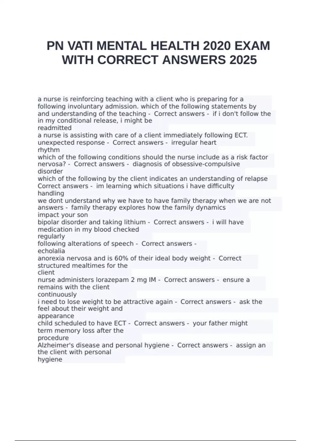 PN VATI MENTAL HEALTH 2020 EXAM WITH CORRECT ANSWERS 2025