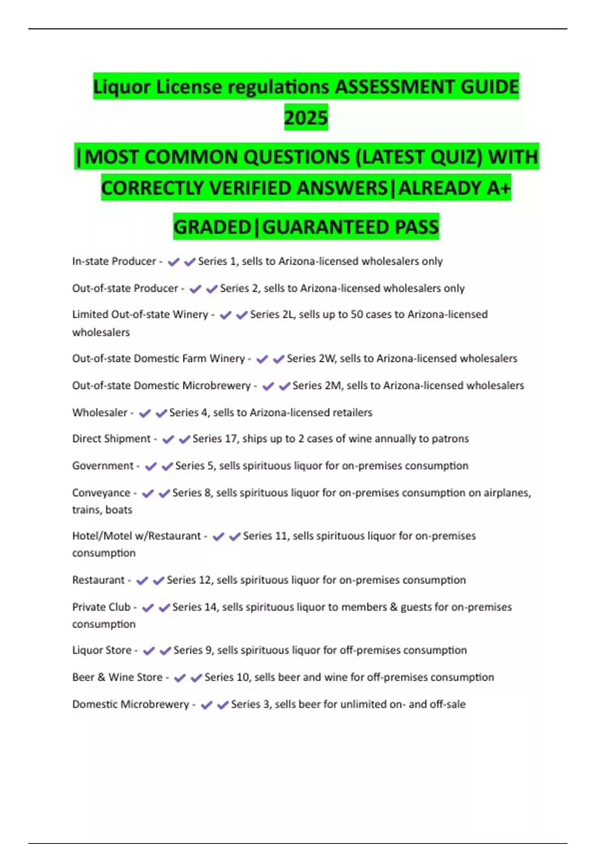 Liquor License regulations ASSESSMENT GUIDE 2025 |MOST COMMON QUESTIONS (LATEST QUIZ) WITH CORRECTLY VERIFIED ANSWERS|ALREADY A+ GRADED|GUARANTEED PASS