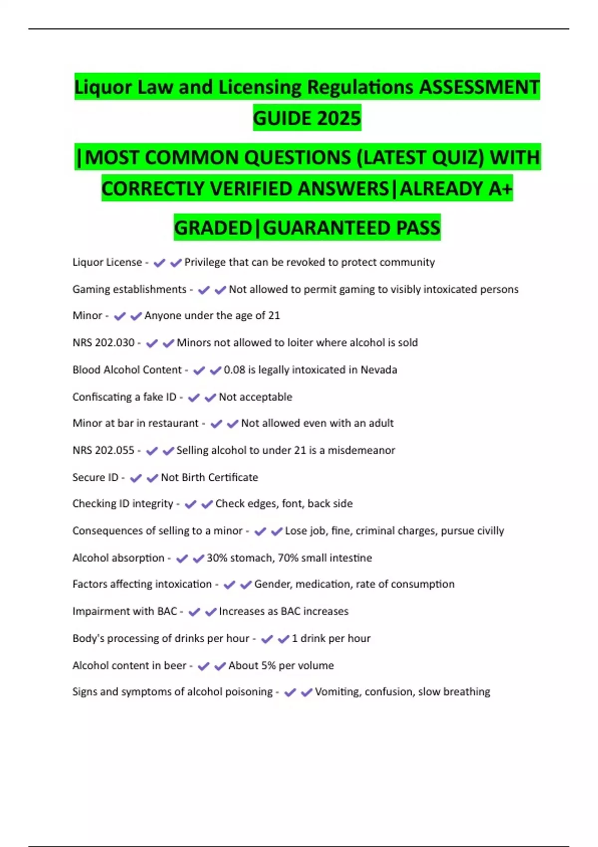 Liquor Law and Licensing Regulations ASSESSMENT GUIDE 2025 |MOST COMMON QUESTIONS (LATEST QUIZ) WITH CORRECTLY VERIFIED ANSWERS|ALREADY A+ GRADED|GUARANTEED PASS