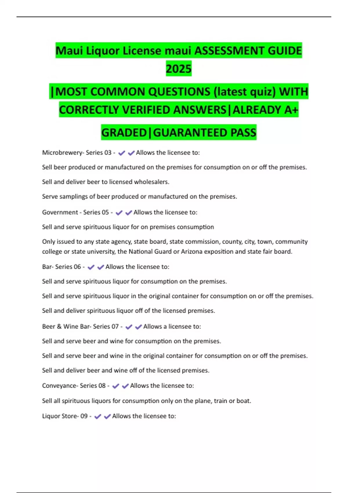 Maui Liquor License maui ASSESSMENT GUIDE 2025 |MOST COMMON QUESTIONS (latest quiz) WITH CORRECTLY VERIFIED ANSWERS|ALREADY A+ GRADED|GUARANTEED PASS