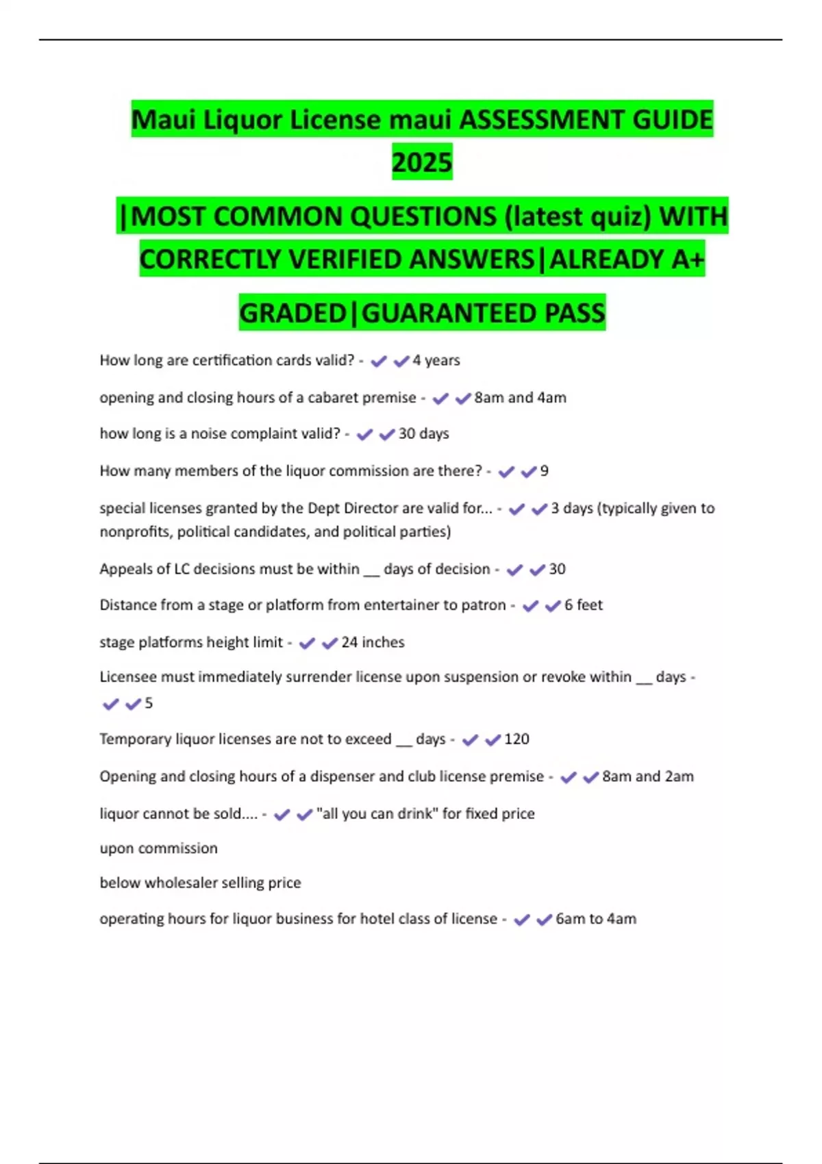 Maui Liquor License maui ASSESSMENT GUIDE 2025 |MOST COMMON QUESTIONS (latest quiz) WITH CORRECTLY VERIFIED ANSWERS|ALREADY A+ GRADED|GUARANTEED PASS